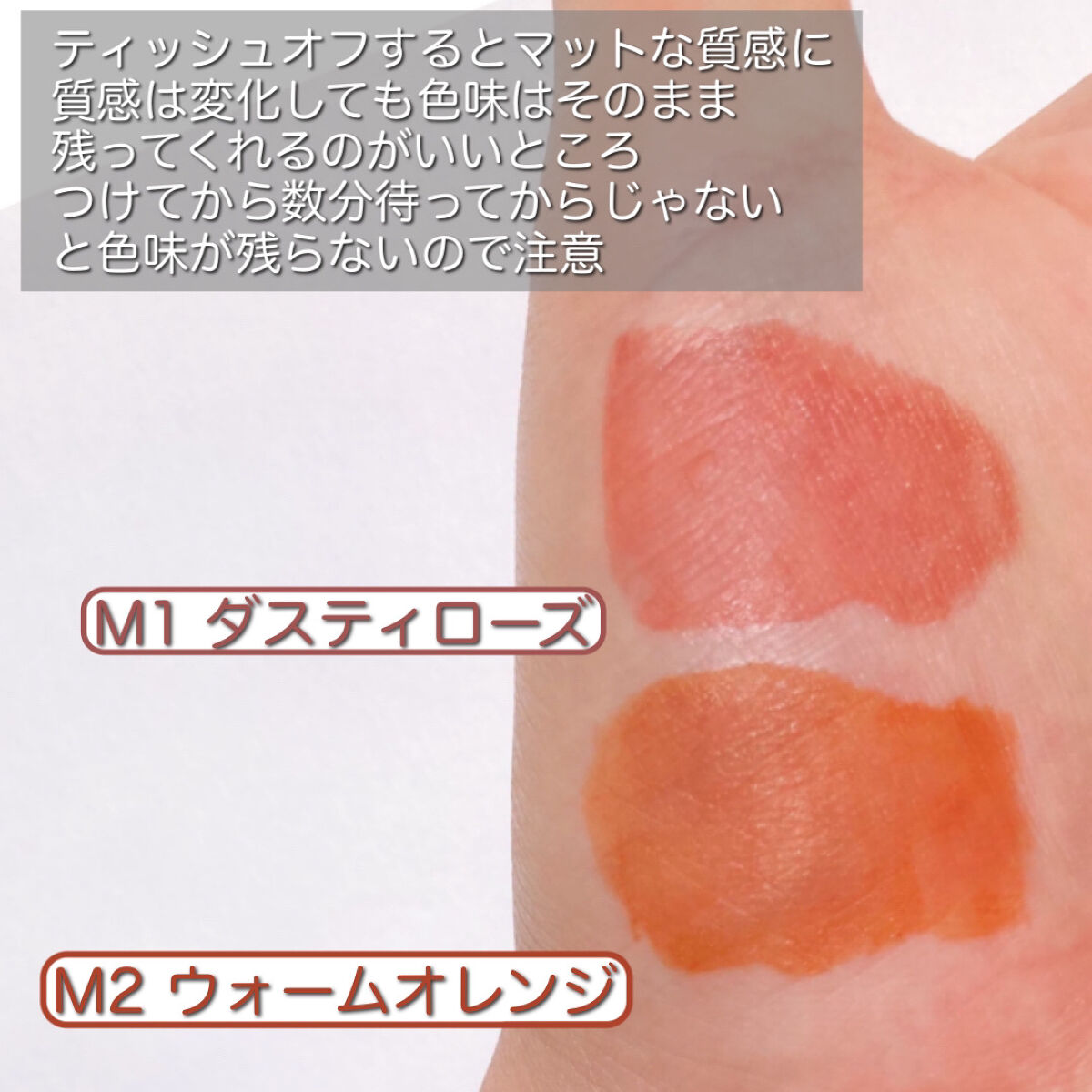 - <M1 ダスティローズ> 水、シリカ、ジフェニルシロキシフェニルトリメチコン、エタノール、ラウロイルグルタミン酸ジ(フィトステリル/オクチルドデシル)、BG、ジフェニルジメチコン、セテス-10、グリセリン、ジカプリン酸ネオペンチルグリコール、オクチルドデカノール、セチルPEG/PPG-10/1ジメチコン、ダイマージリノール酸(フィトステリル/イソステアリル/セチル/ステアリル/ベヘニル)、ダイマージリノール酸ダイマージリノレイル、(アクリル酸ヒドロキシエチル/アクリロイルジメチルタウリンNa)コポリマー、イソヘキサデカン、フェノキシエタノール、メチルパラベン、ポリソルベート60、トコフェロール、エチルパラベン、デヒドロ酢酸Na、リン酸2Na、リン酸Na、シメチコン、スクワラン、ハチミツ、ステアリン酸ソルビタン、ステアリン酸グリセリル、ローヤルゼリーエキス、オレイン酸ポリグリセリル-10、ヒアルロン酸Na、セルロースガム、ローズマリー葉エキス、カミツレ花エキス、水溶性コラーゲン、トリイソステアリン酸ポリグリセリル-2、酸化チタン、酸化鉄、黄4、赤227、水酸化Al、PVP、ポリアスパラギン酸Na、青1、キサンタンガム、EDTA-2Na <M2 ウォームオレンジ> 水、シリカ、ジフェニルシロキシフェニルトリメチコン、エタノール、ラウロイルグルタミン酸ジ(フィトステリル/オクチルドデシル)、BG、ジフェニルジメチコン、セテス-10、グリセリン、ジカプリン酸ネオペンチルグリコール、オクチルドデカノール、セチルPEG/PPG-10/1ジメチコン、ダイマージリノール酸(フィトステリル/イソステアリル/セチル/ステアリル/ベヘニル)、ダイマージリノール酸ダイマージリノレイル、(アクリル酸ヒドロキシエチル/アクリロイルジメチルタウリンNa)コポリマー、イソヘキサデカン、フェノキシエタノール、メチルパラベン、ポリソルベート60、トコフェロール、エチルパラベン、デヒドロ酢酸Na、リン酸2Na、リン酸Na、シメチコン、スクワラン、ハチミツ、ステアリン酸ソルビタン、ステアリン酸グリセリル、ローヤルゼリーエキス、オレイン酸ポリグリセリル-10、ヒアルロン酸Na、セルロースガム、ローズマリー葉エキス、カミツレ花エキス、水溶性コラーゲン、トリイソステアリン酸ポリグリセリル-2、酸化チタン、酸化鉄、黄4、赤227、水酸化Al、PVP、ポリアスパラギン酸Na、青1、キサンタンガム、EDTA-2Na