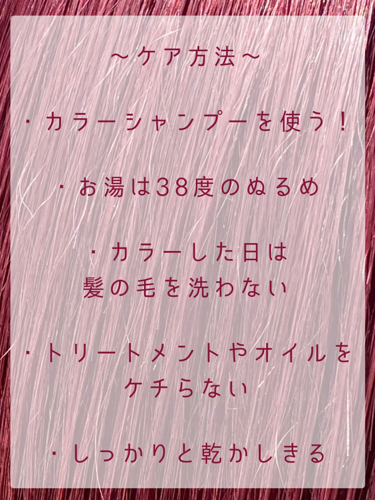 オーダー方法などは画像にまとめました! ピンクの退色ルート カラーシャンプーを使う! お湯は38度! カラーした日はシャンプーしない! トリートメントなどは惜しみなく使う! 髪の毛を乾かしきる! 今回は、ピンクカラーだけでなく、ハイトーンカラー全般に使える知識を交えつつケア方法などをご紹介させて頂きました! カラー剤や美容師さんに寄って異なるケア方法があると思うので、カラーした際はぜひ美容師さんに沢山質問してみてください