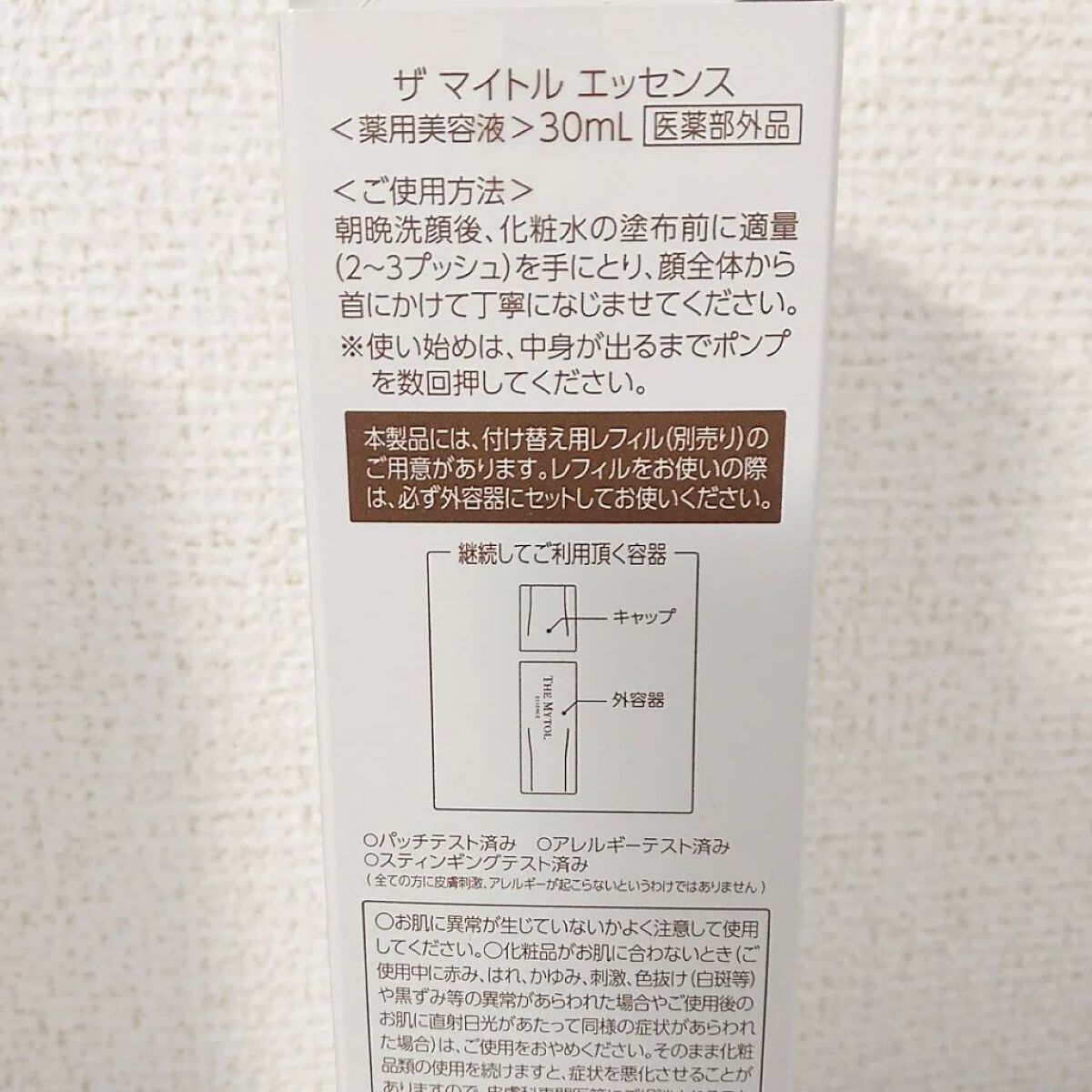 ザ マイトル エッセンスは大正製薬の先端技術を活かした先行美容液で、洗顔後のまっさらな肌に使うことで、次のスキンケアがもっと楽しみになるアイテム💖 ✔ 有効成分ナイアシンアミドを配合し、気になるシワを改善します。 肌の上でとろけるように馴染むテクスチャーで、伸びも良くて気持ちいい🥰