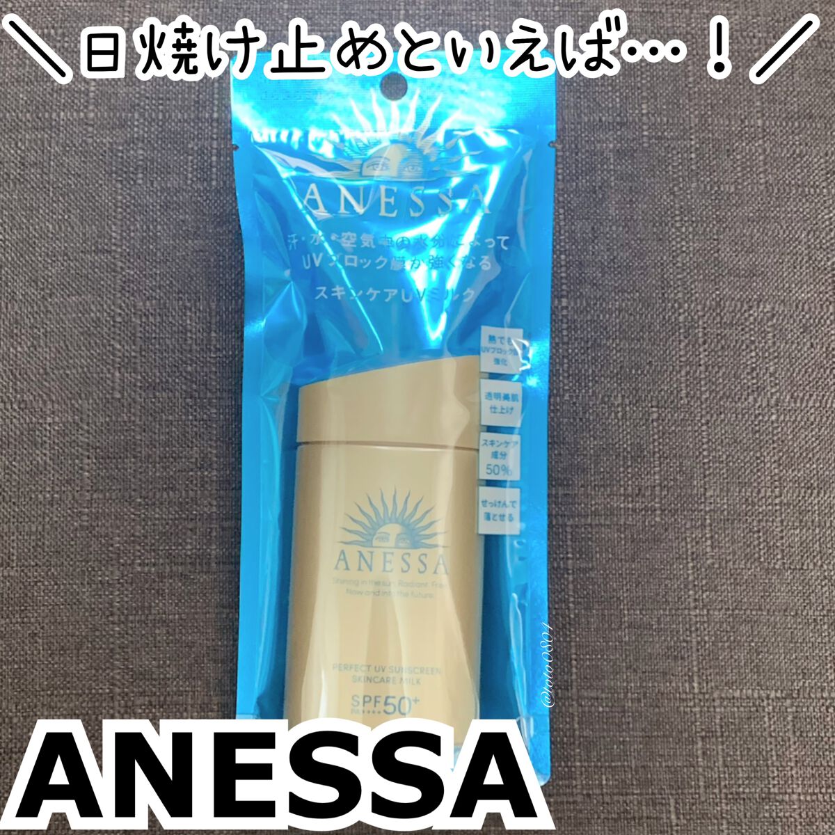 - 顔・からだ用 SPF50+ ・ PA++++ 汗、水、熱、そして空気中の水分に反応してUVブロック膜が強くなる技術搭載 最強※8 UVスキンケアミルク ※8 「最強」とはSPF50+・PA++++、及びアネッサ内ウォータープルーフ効果を意味する。 〇汗・水・熱、そして空気中の水分に自動的に反応して、UVブロック膜が強くなります。-オートブースター技術 〇透明美肌仕上げ-ビューティーアップ効果 “ビューティーアップ粉末”を新配合透明感のある美しいつや肌へ ○スキ ン ケア成 分 50% 配合 〇植物由来成分をブレンドした、紫外線による 乾燥 ダメージを防 ぐ 、うるおいを与える保湿美肌成分 黄花エキス、緑茶エキス、異性化糖、グリセリン 〇保湿 成分 コラーゲン、 スーパーヒアルロン酸※ 9 、 グリセリン ※9 アセチルヒアルロン 酸 Na 〇保湿持続 効果 ○スーパーウォータープルーフ 〇マスク蒸れ対応 〇耐こすれ ○化粧下地効果 ○せっけんで落とせ る 〇さらさらミルク ○生まれ変わった 、 心地よいフルーティーフローラルの香り 〇大気中に浮遊する微粒子、 PM2 .5 などから肌を保護 し ま す。-微粒子付着防止対応 ○砂が肌 につきにくいサンドプルーフ効果 〇海に流れ出にくいオーシャンフレンドリー処方※6 ※6 自社品内の耐水処方でない商品と比較 ○環境に優しいサステナブルなボトル ○植物由来の原料を一部使用した袋 〇オキシベンゾン 、 オクチノキサート無配合 ○無着色・ ノンコメドジェニックテスト・ アレルギーテスト済み (全ての方にニキビができない、アレルギ ーが起きないというわ けではありません)