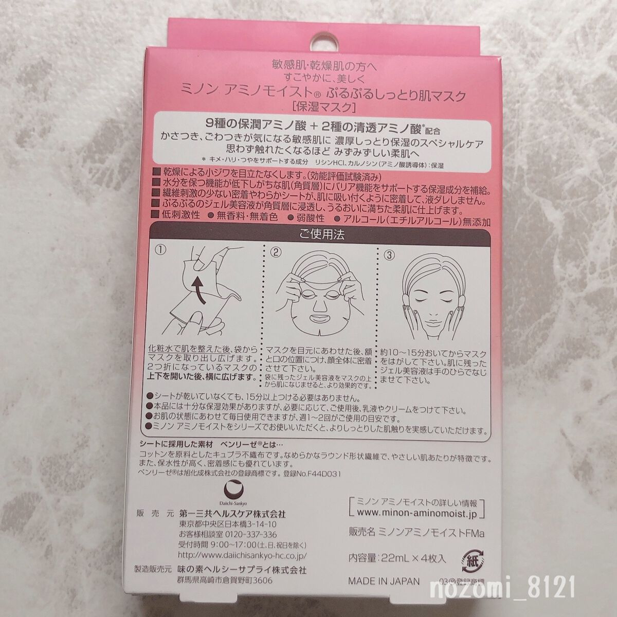 - 思わず触れたくなるほどみずみずしい肌へ。うるおって透明感。 乾燥による小ジワを目立たなくします(効能評価試験済み) 水分を保つ機能が低下しがちな角質層に、バリア機能をサポートする保湿成分を補給 ぷるぷるジェルがしみこんだ密着やわらかシートで、液ダレしません ◎ミノン アミノモイストのシートマスクは化粧水で肌を整えた後にお使いいただく「美容液マスク」です。 週に1-2回のスペシャルケアとしておすすめです♪