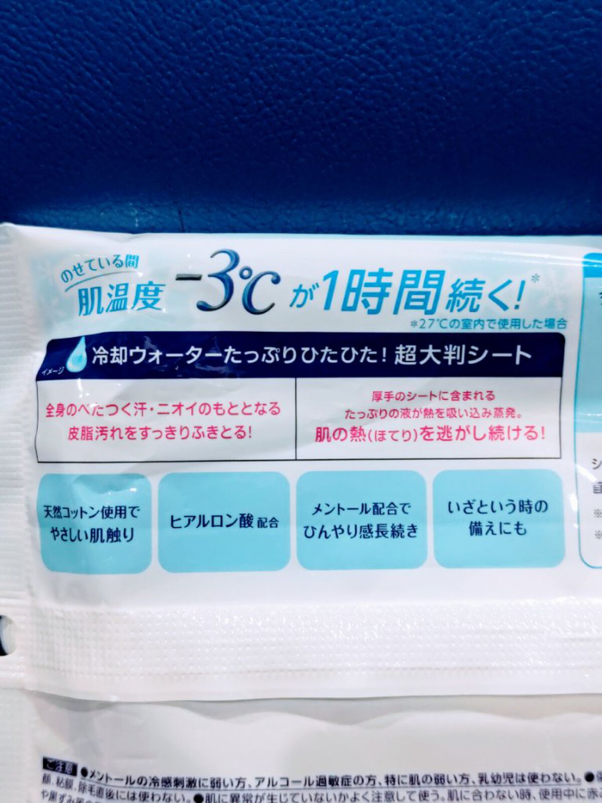 - ●のせている間、肌温度-3℃が1時間続く※汗ふきシート ●冷却ウォーターたっぷりひたひたの超大判シート(46㎝×23㎝) ●個装タイプ(1枚入×5包) ●無香性 ●全身のべたつく汗・ニオイのもととなる皮脂汚れをスッキリふきとる ●厚手のシートに含まれるたっぷりの冷却ウォーターが熱を吸い込み蒸発。肌の熱(ほてり)を逃がし続ける ●天然コットン使用 ●ヒアルロン酸配合 ●メントール配合でひんやり感長続き ※27℃のオフィス環境で、肌温度-3℃が1時間継続。(使用環境により異なります)