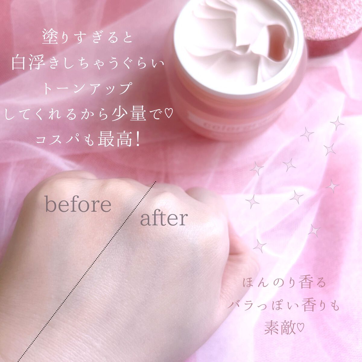 - まるでバラの花びらのようにやわらかくしっとりトーンアップ※クリーム。 ※メイクアップ効果による SPF30 PA++ スキンケアの最後に塗るだけで、花を咲かせるようにパッとみずみずしい肌に仕上げます。 保湿感はあるのに、ベタつきにくく軽やかな仕上がり。 POINT1:華やかなピンクカラートーンアップ くすんだ肌トーンをナチュラルに明るくピンク色のトーンアップクリーム POINT2:花を加えたようにイキイキとした印象の肌に 保湿成分バラエキス、桜エキス、蓮の花エキスが含まれており明るく華やかな肌に仕上げるトーンアップクリーム POINT3:べたつきにくい軽く爽やかな仕上がり しっとりとしたウォータリーテクスチャーが肌に密着されべたつきにくく爽やかに仕上がるトーンアップクリーム #花びらキメクリーム #華やかなピンクカラートーンアップ