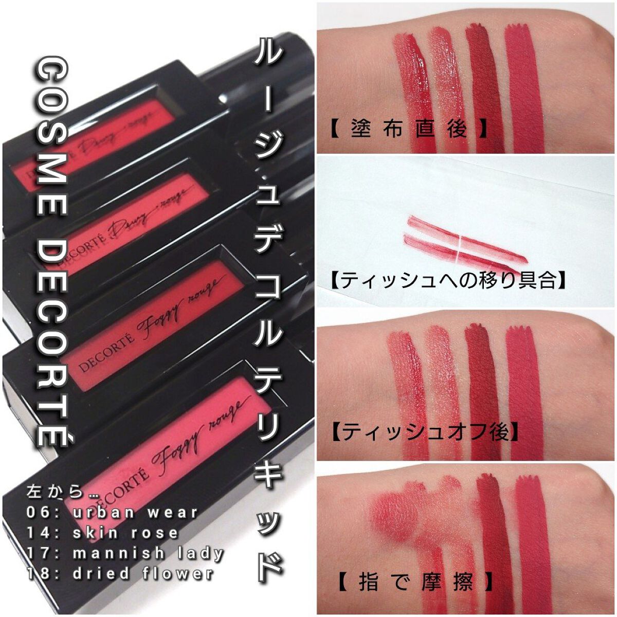 - <01 signature red(Dewy rouge )> ヘキサ(ヒドロキシステアリン酸/ステアリン酸/ロジン酸)ジペンタエリスリチル、トリメチルシロキシケイ酸、イソドデカン、ジフェニルシロキシフェニルトリメチコン、ジカプリン酸ネオペンチルグリコール、マイクロクリスタリンワックス、リンゴ酸ジイソステアリル、トリイソステアリン酸ポリグリセリル-2、ジフェニルジメチコン、水添ポリイソブテン、ラウロイルグルタミン酸ジ(オクチルドデシル/フィトステリル/ベヘニル)、(エチレン/プロピレン)コポリマー、ジメチルシリル化シリカ、パルミチン酸デキストリン、ジステアルジモニウムヘクトライト、アストロカリウムムルムル種子脂、ゼニアオイエキス、ダマスクバラ花エキス、トコフェロール、マツリカ花エキス、レモン果実エキス、BG、BHT、DPG、PEG-9ポリジメチルシロキシエチルジメチコン、エタノール、キサンタンガム、シリカ、ジイソステアリン酸ポリグリセリル-2、ジメチコン、スクワラン、ハイドロゲンジメチコン、パーフルオロヘキシルエチルトリエトキシシラン、ホウケイ酸(Ca/Al)、ミネラルオイル、メタクリル酸メチルクロスポリマー、メチコン、ラウリルPEG-9ポリジメチルシロキシエチルジメチコン、レシチン、水、水酸化Al、炭酸Ca、麻セルロース、フェノキシエタノール、香料、オキシ塩化ビスマス、マイカ、酸化チタン、酸化鉄、黄4、赤202 <05 signature red(Foggy rouge)> イソドデカン、トリメチルシロキシケイ酸、合成ワックス、ジカプリン酸ネオペンチルグリコール、合成金雲母、ワセリン、(エチレン/プロピレン)コポリマー、シリカ、エチルヘキサン酸セチル、ジメチコン、アストロカリウムムルムル種子脂、ゼニアオイエキス、ダマスクバラ花エキス、トコフェロール、マツリカ花エキス、レモン果実エキス、BG、BHT、DPG、PEG-9ポリジメチルシロキシエチルジメチコン、エタノール、キサンタンガム、ジイソステアリン酸ポリグリセリル-2、ジステアルジモニウムヘクトライト、スクワラン、パーフルオロヘキシルエチルトリエトキシシラン、パルミチン酸デキストリン、ホウケイ酸(Ca/Al)、ミネラルオイル、メタクリル酸メチルクロスポリマー、ラウリルポリグリセリル-3ポリジメチルシロキシエチルジメチコン、レシチン、水、水酸化Al、炭酸Ca、麻セルロース、フェノキシエタノール、香料、オキシ塩化ビスマス、マイカ、酸化チタン、酸化鉄、黄4、赤202 <06 urban wear(Dewy rouge )> ヘキサ(ヒドロキシステアリン酸/ステアリン酸/ロジン酸)ジペンタエリスリチル、トリメチルシロキシケイ酸、イソドデカン、ジフェニルシロキシフェニルトリメチコン、ジカプリン酸ネオペンチルグリコール、マイクロクリスタリンワックス、リンゴ酸ジイソステアリル、トリイソステアリン酸ポリグリセリル-2、ジフェニルジメチコン、水添ポリイソブテン、ラウロイルグルタミン酸ジ(オクチルドデシル/フィトステリル/ベヘニル)、(エチレン/プロピレン)コポリマー、ジメチルシリル化シリカ、パルミチン酸デキストリン、ジステアルジモニウムヘクトライト、アストロカリウムムルムル種子脂、ゼニアオイエキス、ダマスクバラ花エキス、トコフェロール、マツリカ花エキス、レモン果実エキス、BG、BHT、DPG、PEG-9ポリジメチルシロキシエチルジメチコン、エタノール、キサンタンガム、シリカ、ジイソステアリン酸ポリグリセリル-2、ジメチコン、スクワラン、ハイドロゲンジメチコン、パーフルオロヘキシルエチルトリエトキシシラン、ホウケイ酸(Ca/Al)、ミネラルオイル、メタクリル酸メチルクロスポリマー、メチコン、ラウリルPEG-9ポリジメチルシロキシエチルジメチコン、レシチン、水、水酸化Al、炭酸Ca、麻セルロース、フェノキシエタノール、香料、オキシ塩化ビスマス、マイカ、酸化チタン、酸化鉄、黄4、赤202 <08 bitter lips(Dewy rouge )> ヘキサ(ヒドロキシステアリン酸/ステアリン酸/ロジン酸)ジペンタエリスリチル、トリメチルシロキシケイ酸、イソドデカン、ジフェニルシロキシフェニルトリメチコン、ジカプリン酸ネオペンチルグリコール、マイクロクリスタリンワックス、トリイソステアリン酸ポリグリセリル-2、リンゴ酸ジイソステアリル、ジフェニルジメチコン、水添ポリイソブテン、ラウロイルグルタミン酸ジ(オクチルドデシル/フィトステリル/ベヘニル)、(エチレン/プロピレン)コポリマー、ジメチルシリル化シリカ、パルミチン酸デキストリン、ジステアルジモニウムヘクトライト、アストロカリウムムルムル種子脂、ゼニアオイエキス、ダマスクバラ花エキス、トコフェロール、マツリカ花エキス、レモン果実エキス、BG、BHT、DPG、PEG-9ポリジメチルシロキシエチルジメチコン、エタノール、キサンタンガム、シリカ、ジイソステアリン酸ポリグリセリル-2、ジメチコン、スクワラン、ハイドロゲンジメチコン、パーフルオロヘキシルエチルトリエトキシシラン、ホウケイ酸(Ca/Al)、ミネラルオイル、メタクリル酸メチルクロ