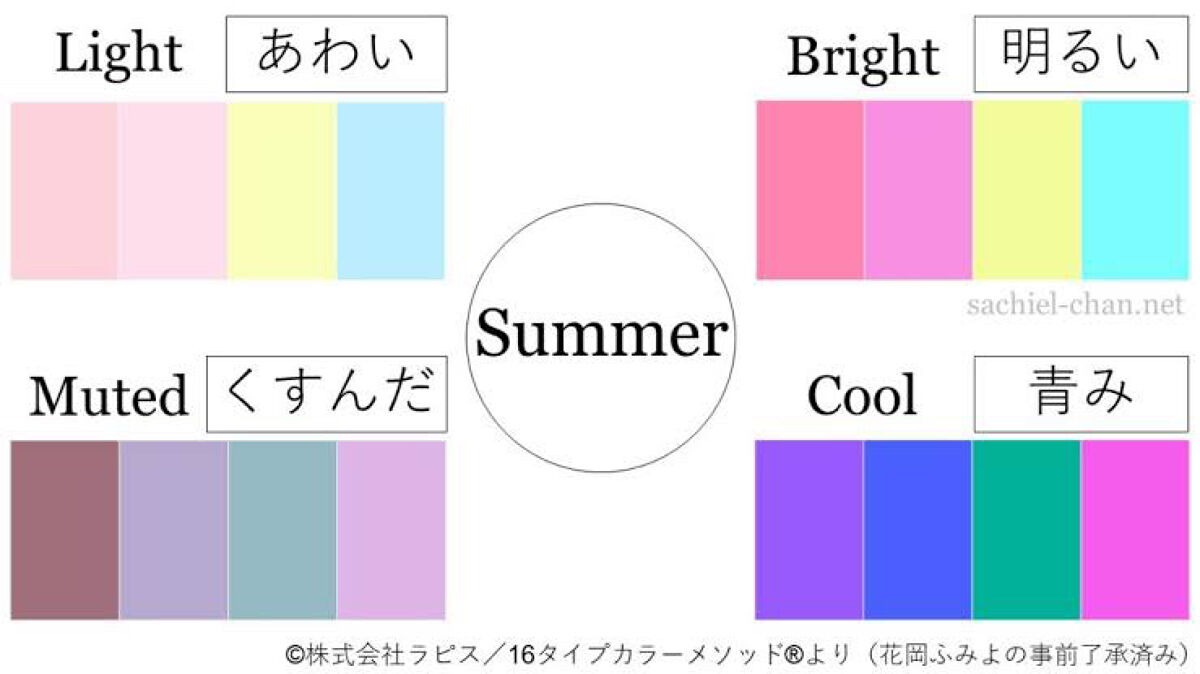 皆さんがブルベ夏で想像するような白と水色のような柔らかい配色は悪くはないのですが、印象がぼやけて見えるのでどこかに濃いめの色を入れるのがオススメです!とりあえずどこかに青みのある濃い色入れとけば間違いないです!(投げやり)