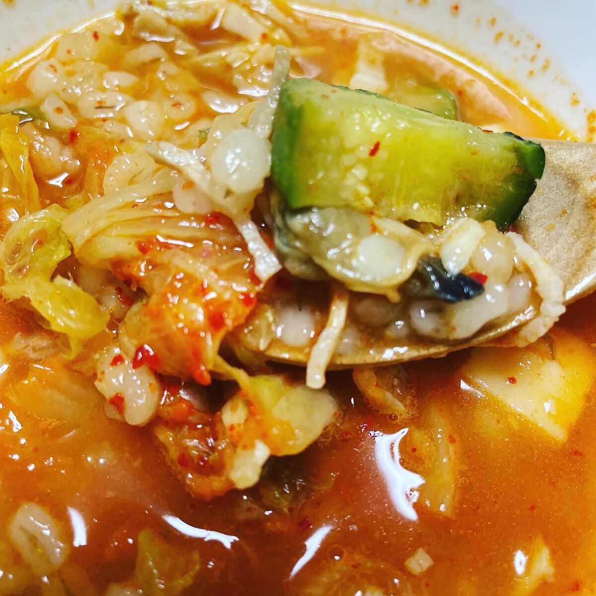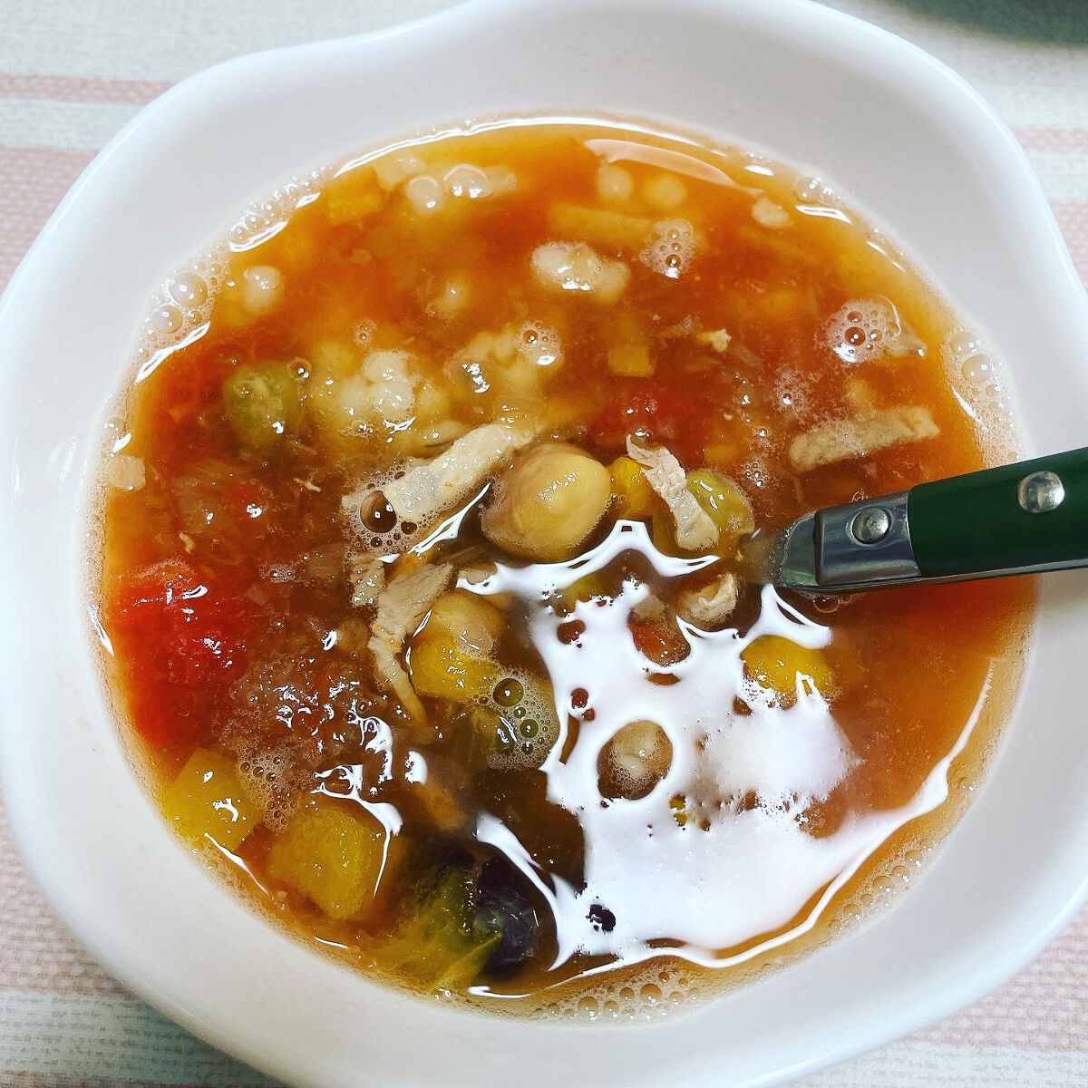 LACCOKMARCHEmochimugisoup✨・九州味噌とキムチのおひとり様チゲ鍋スープ・3種のお豆ごろごろ夕日色チリコンカン・ブタちゃん観覧車とザーサイの中華スープ・オクラとモロヘイヤの和風ねばねばスープ今回はこの4種類を食べました🌸...