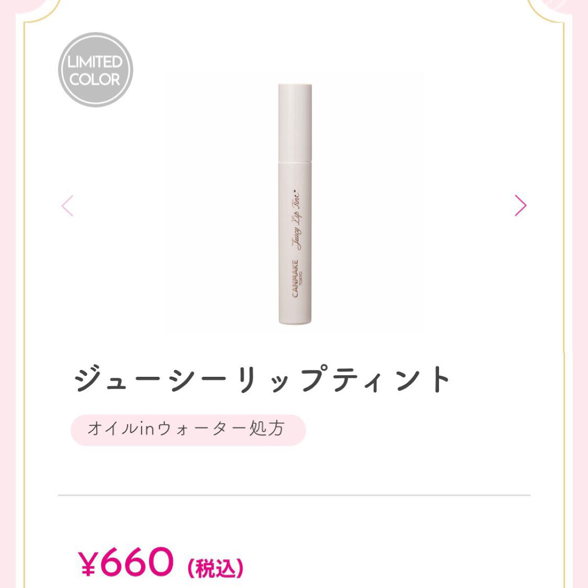 - ツヤ膜でLIPカラーを閉じ込める 塗ってから「5分」でかわいい唇完成♥ツヤがあふれ出るオイルinウォーターティント 水に対して約2倍のオイル成分を配合した「オイルinウォーター処方」 時間経過でツヤ膜がじゅわ~っとあふれ出し、 まるでグロスを重ねたような仕上がりに。みずみずしいツヤ感が持続します。 塗布後、時間経過(※)で色が定着して食べても飲んでも血色長持ち。 (※定着には個人差があります。弊社5分推奨) 高密着で唇に溶け込むように色づきます。 コップやペットボトルへの色移りがしにくくなります。