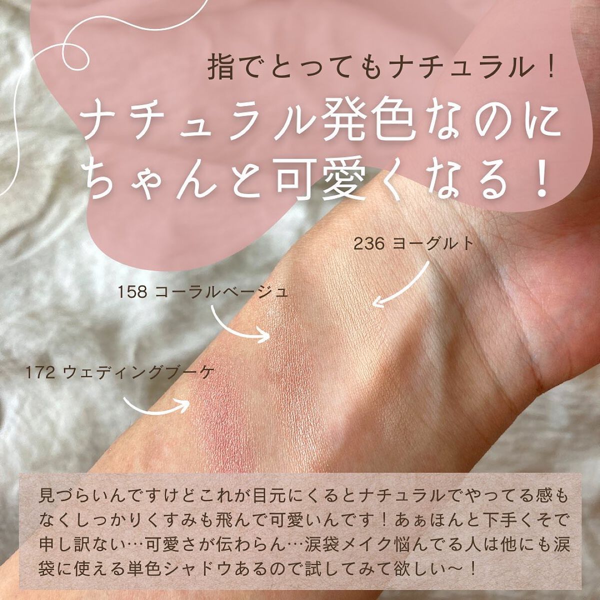 ほんっっっとに可愛いので安心して買ってください😂きっと買うか悩んでる人多いと思うので…大丈夫です!かわいいし使えるしかわいいです! ナチュラル発色でどの色でも涙袋が盛れる! ざくざくラメがアクセントになって可愛い! もったいなくてがつがつ使えない!!本当は毎日使いたい! 個人的にはほんとにどの色を使っても涙袋メイクが可愛く仕上がるので涙袋のためのパレットだと思ってるし涙袋のために買ってもコスパいいと思ってます!もう1つ欲しい😂