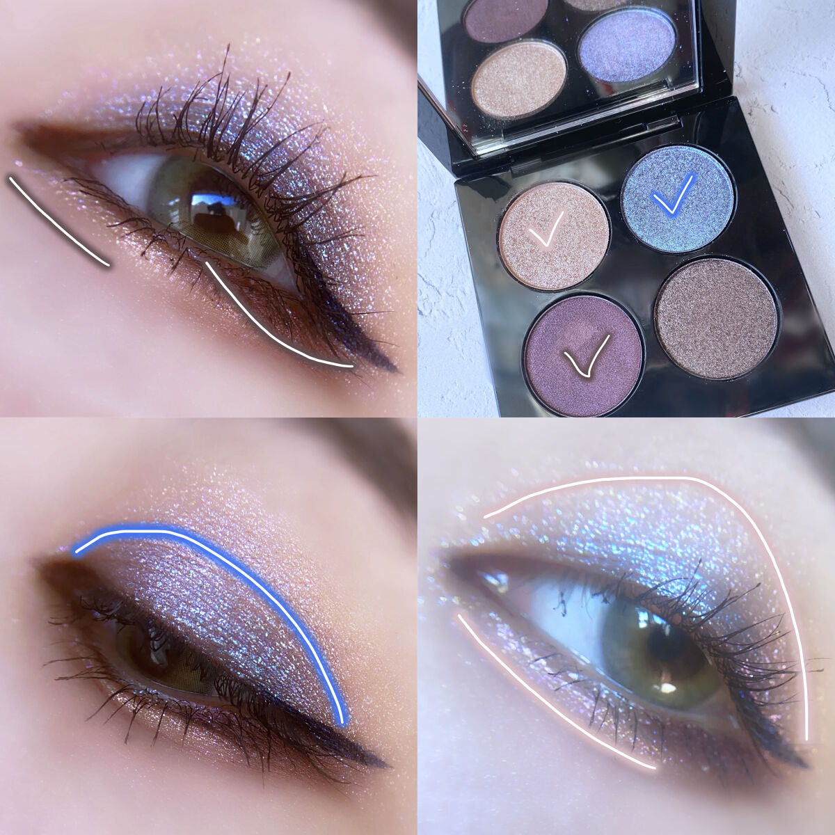 べターザンパレット04は全色マットテクスチャのグレイッシュパレット これが本当に、ブルベ冬さん盛れます。 サラサラしていてムラになりにくいし グラデもしやすいので初心者さんにも使いやすい◎ べターザンパレット00は逆に全色グリッター✨ 大小様々なグリッターがあるのでメイクの幅がかなり広がります🥰 パレットの色味ほど色は乗らないのでメイクの邪魔をせず好きなように使えるのも◎