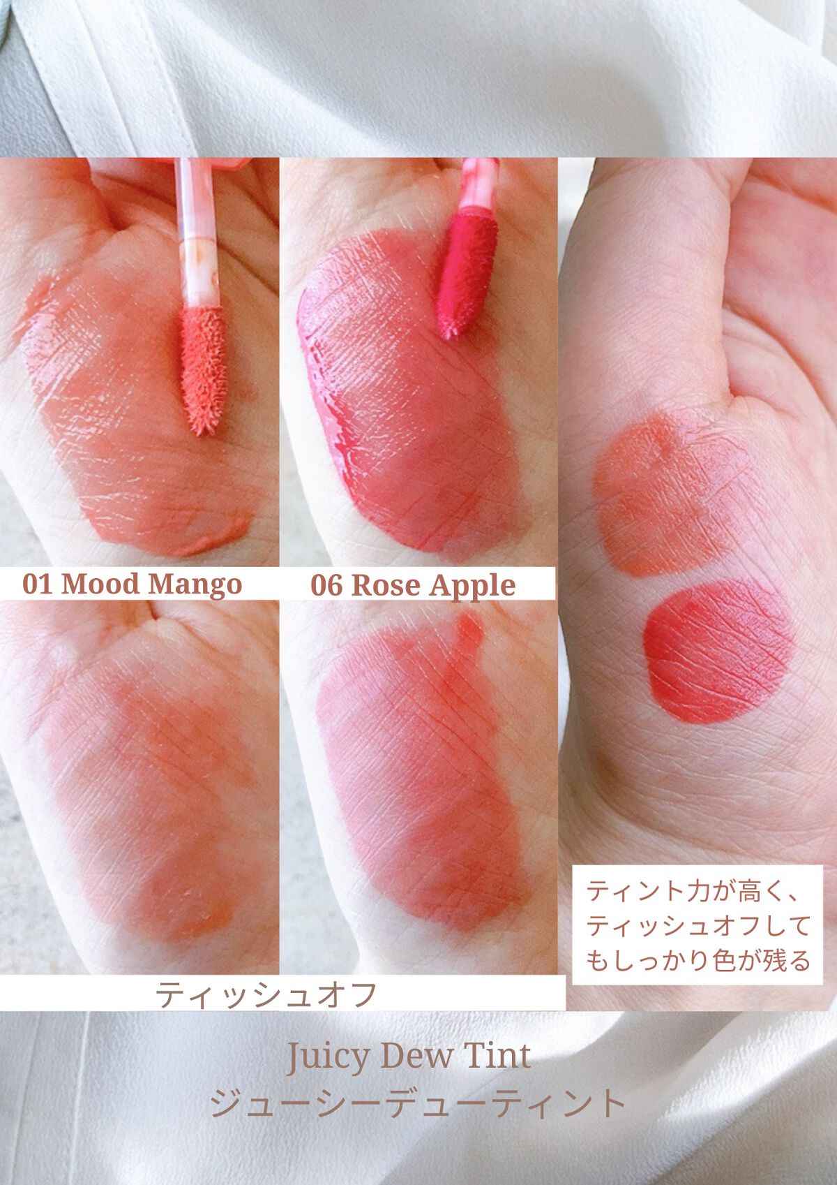 - <01 ムードマンゴー> 水、ジフェニルジメチコン、リンゴ酸ジイソステアリル、ビスジグリセリルポリアシルアジペート-2、ジグリセリン、水添ポリイソブテン、ダイマージリノール酸(フィトステリル/イソステアリル/セチル/ステアリル/ベヘニル)、ポリソルベート60、セチルPEG/PPG-10/1ジメチコン、DPG、ポリフェニルシルセスキオキサン、イソステアリン酸ソルビタン、ダイマージリノール酸ジイソステアリン酸ポリグリセリル-3、1,2-ヘキサンジオール、オクチルドデカノール、トリ(カプリル酸/カプリン酸)グリセリル、(アクリル酸ヒドロキシエチル/アクリロイルジメチルタウリンNa)コポリマー、セテアリルアルコール、酸化チタン、スクワラン、フェノキシエタノール、赤102、安息香酸ベンジル、エチルヘキシルグリセリン、黄4、香料、赤104(1)、水酸化Al、黄5、ポリアクリル酸アンモニウム、リナロール、BG、青1、塩化Na、ヘキシルシンナマル、トコフェロール <02 メロンシャーベット> 水、ジフェニルジメチコン、リンゴ酸ジイソステアリル、ビスジグリセリルポリアシルアジペート-2、ジグリセリン、水添ポリイソブテン、ダイマージリノール酸(フィトステリル/イソステアリル/セチル/ステアリル/ベヘニル)、ポリソルベート60、セチルPEG/PPG-10/1ジメチコン、DPG、ポリフェニルシルセスキオキサン、イソステアリン酸ソルビタン、ダイマージリノール酸ジイソステアリン酸ポリグリセリル-3、1,2-ヘキサンジオール、オクチルドデカノール、トリ(カプリル酸/カプリン酸)グリセリル、酸化チタン、(アクリル酸ヒドロキシエチル/アクリロイルジメチルタウリンNa)コポリマー、セテアリルアルコール、スクワラン、フェノキシエタノール、赤102、黄4、安息香酸ベンジル、エチルヘキシルグリセリン、赤104(1)、香料、水酸化Al、ポリアクリル酸アンモニウム、赤227、リナロール、BG、塩化Na、ヘキシルシンナマル、トコフェロール <03 ピンクグアバ> 水、ジフェニルジメチコン、リンゴ酸ジイソステアリル、ビスジグリセリルポリアシルアジペート-2、ジグリセリン、水添ポリイソブテン、ダイマージリノール酸(フィトステリル/イソステアリル/セチル/ステアリル/ベヘニル)、ポリソルベート60、セチルPEG/PPG-10/1ジメチコン、DPG、ポリフェニルシルセスキオキサン、イソステアリン酸ソルビタン、ダイマージリノール酸ジイソステアリン酸ポリグリセリル-3、1,2-ヘキサンジオール、オクチルドデカノール、トリ(カプリル酸/カプリン酸)グリセリル、(アクリル酸ヒドロキシエチル/アクリロイルジメチルタウリンNa)コポリマー、セテアリルアルコール、スクワラン、フェノキシエタノール、酸化チタン、赤104(1)、安息香酸ベンジル、エチルヘキシルグリセリン、黄5、香料、水酸化Al、ポリアクリル酸アンモニウム、リナロール、赤227、BG、青1、ヘキシルシンナマル、トコフェロール <04 プラムデュー> 水、ジフェニルジメチコン、リンゴ酸ジイソステアリル、ビスジグリセリルポリアシルアジペート-2、ジグリセリン、水添ポリイソブテン、ダイマージリノール酸(フィトステリル/イソステアリル/セチル/ステアリル/ベヘニル)、ポリソルベート60、セチルPEG/PPG-10/1ジメチコン、DPG、ポリフェニルシルセスキオキサン、イソステアリン酸ソルビタン、ダイマージリノール酸ジイソステアリン酸ポリグリセリル-3、1,2-ヘキサンジオール、オクチルドデカノール、トリ(カプリル酸/カプリン酸)グリセリル、(アクリル酸ヒドロキシエチル/アクリロイルジメチルタウリンNa)コポリマー、セテアリルアルコール、酸化チタン、スクワラン、フェノキシエタノール、赤104(1)、黄5、赤227、安息香酸ベンジル、エチルヘキシルグリセリン、香料、黄4、水酸化Al、ポリアクリル酸アンモニウム、リナロール、BG、ヘキシルシンナマル、塩化Na、トコフェロール <05 モーブベリー> 水、ジフェニルジメチコン、リンゴ酸ジイソステアリル、ビスジグリセリルポリアシルアジペート-2、ジグリセリン、水添ポリイソブテン、ダイマージリノール酸(フィトステリル/イソステアリル/セチル/ステアリル/ベヘニル)、ポリソルベート60、セチルPEG/PPG-10/1ジメチコン、DPG、ポリフェニルシルセスキオキサン、イソステアリン酸ソルビタン、ダイマージリノール酸ジイソステアリン酸ポリグリセリル-3、1,2-ヘキサンジオール、オクチルドデカノール、トリ(カプリル酸/カプリン酸)グリセリル、(アクリル酸ヒドロキシエチル/アクリロイルジメチルタウリンNa)コポリマー、セテアリルアルコール、酸化チタン、スクワラン、フェノキシエタノール、赤227、黄5、安息香酸ベンジル、エチルヘキシルグリセリン、香料、水酸化Al、ポリアクリル酸アンモニウム、リナロール、黄4、BG、ヘキシルシンナマル、塩化Na、トコフェロール <06 ローズアップル> 水、ジフェニルジメチコン、リンゴ酸ジイソステアリル、ビスジグリセリルポリアシルアジペート-2、ジグリセリン、水添ポリイソブテン、ダイマージリノー
