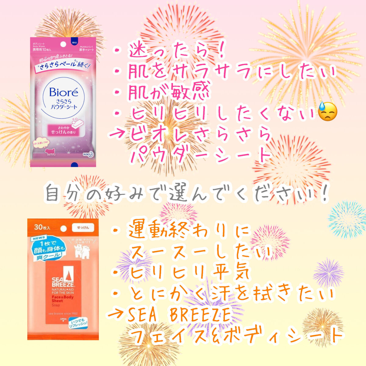 〜汗拭きシート2種比較〜今回はわたしが使っている2つの汗拭きシートを比較していきます✊比較する商品❤︎❤︎ ➀SEABREEZEフェイス&ボディシート せっけんの香り 30枚入り ¥365 ➁ビオレさらさらパウダーシート さわやかなせっ...