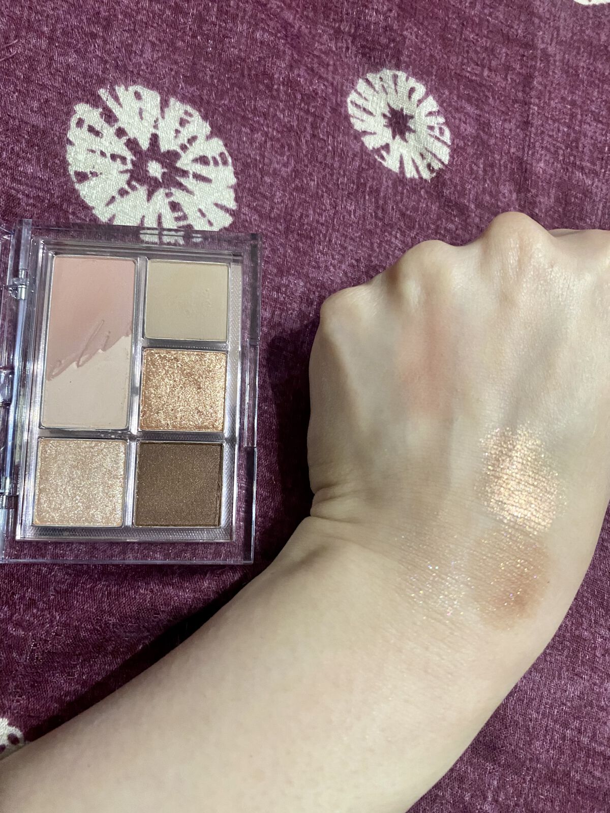 - 同系色陰影カラーと上品でクリアなグリッターの組み合わせの必要なカラーだけ詰め込んだミニアイパレット!