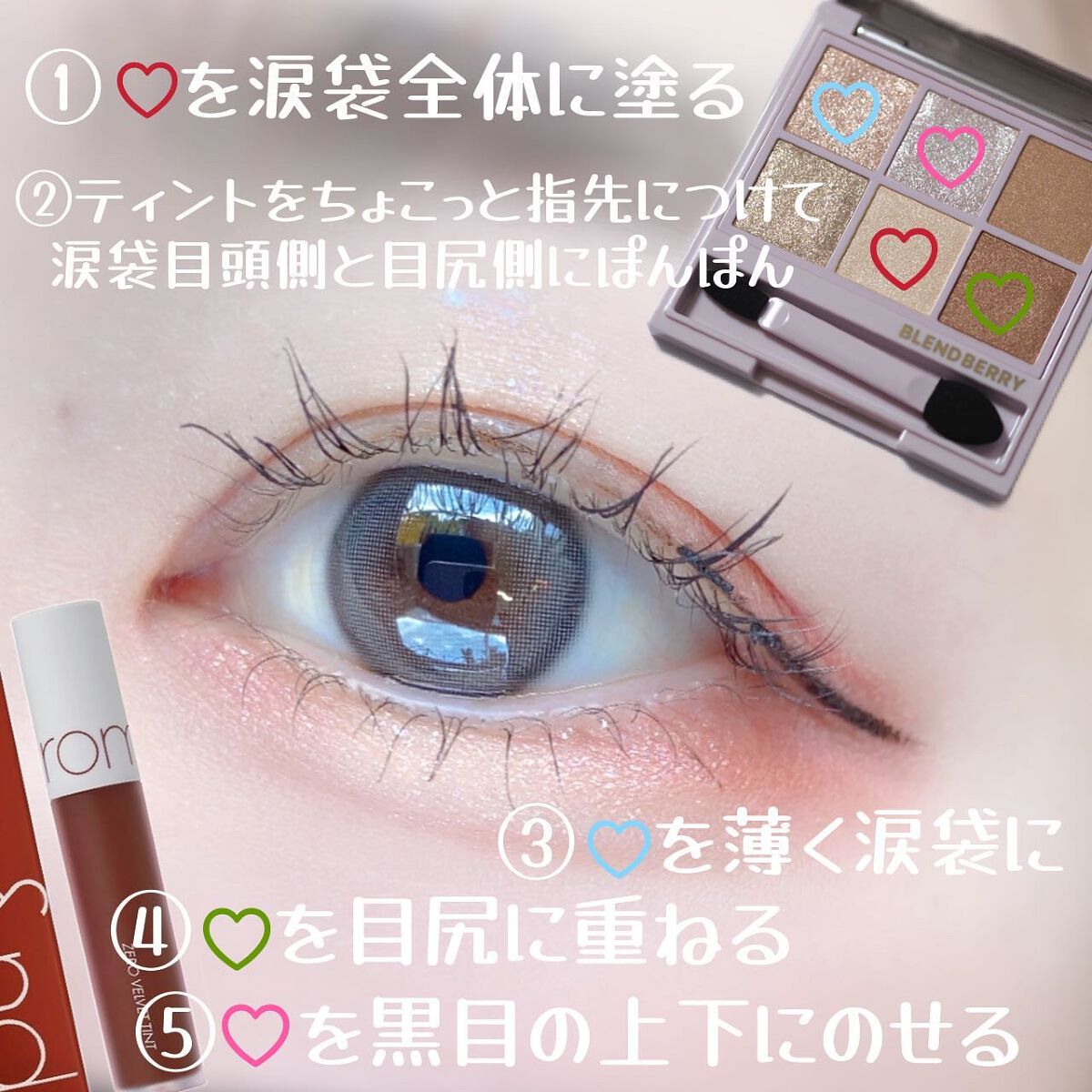 使っているのは、クリオのアイシャドウパレット/シンプリーピンクと、ブレンドベリーのアイシャドウパレット/いちごミルク&ピンクブラウン(本日発売)、ロムアンドゼロベルベットティント/ディープソウルで、カラコンはNARERUの文月ベージュを使用しています。 全体的に目尻重めにすると、遠心顔の印象になり幼い可愛らしい雰囲気になります🍼 目を下と横に拡張していくイメージで作っています…໒꒱⋆゚ 涙袋の影は、ユアグラムのアイブロウパウダーで描いています◎