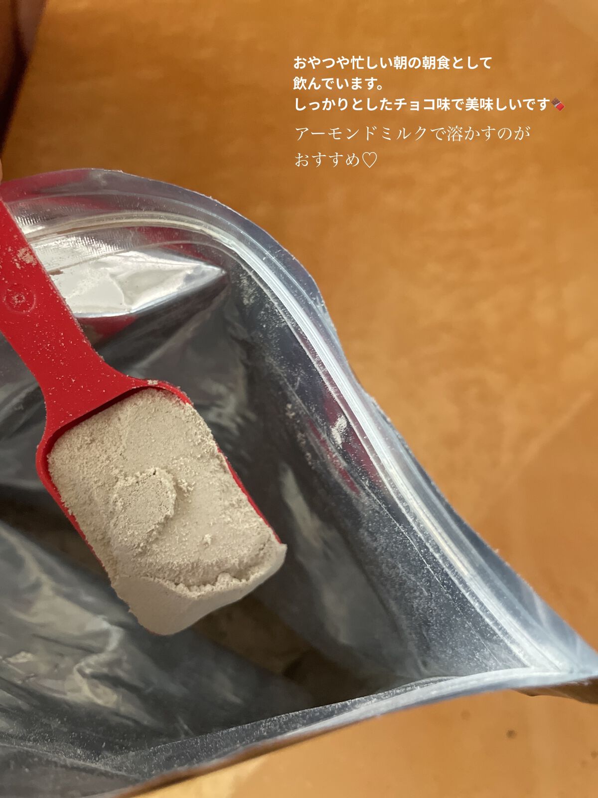 タンパク質スリムシェイク3包入☑きな粉味☑チョコ味☑抹茶味このパウチに水や牛乳や豆乳を混ぜてフリフリ〜不器用な私は牛乳入れる時にこぼしたぁ〜ヾ(*’O’*)/つぶつぶ?ザクザク?食感があってドロっとした感じも少なく線で濃さも調...
