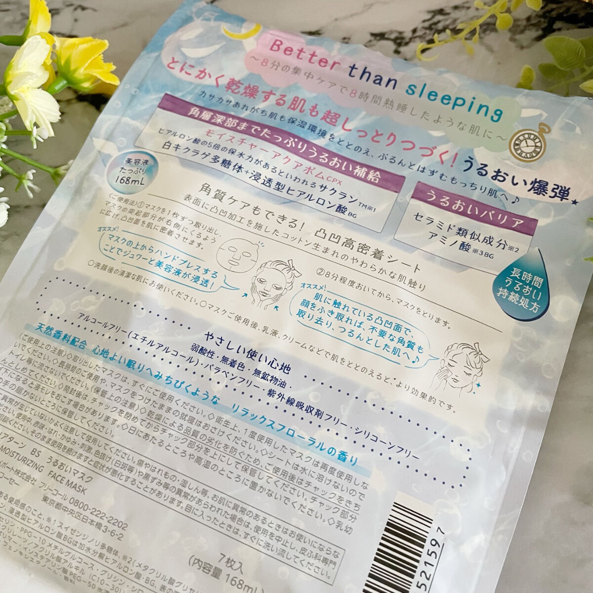 - とにかく乾燥で悩む肌に 爆弾級のうるおいつづく『うるおい爆弾★マスク』 ❶ 超しっとり!『長時間うるおい持続処方』 ひどく乾燥してあれがちな肌も保湿環境をととのえ ぷるんとはずむもっちりうるおい肌へ ❷心地よい眠りへみちびくようなリラックスフローラルの香り やさしい使い心地 弱酸性・無着色・無鉱物油・アルコールフリー(エチルアルコール) パラベンフリー・紫外線吸収剤フリー・シリコーンフリー ※2024年2月21日〜パッケージリニューアル。