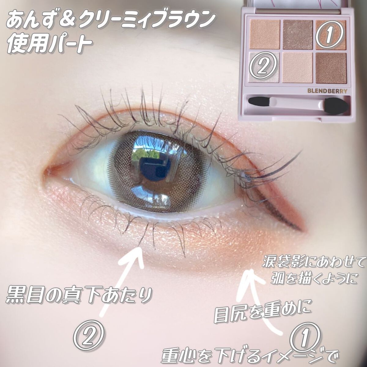 使っているのは、クリオのアイシャドウパレット/シンプリーピンクと、ブレンドベリーのアイシャドウパレット/いちごミルク&ピンクブラウン(本日発売)、ロムアンドゼロベルベットティント/ディープソウルで、カラコンはNARERUの文月ベージュを使用しています。 全体的に目尻重めにすると、遠心顔の印象になり幼い可愛らしい雰囲気になります🍼 目を下と横に拡張していくイメージで作っています…໒꒱⋆゚ 涙袋の影は、ユアグラムのアイブロウパウダーで描いています◎