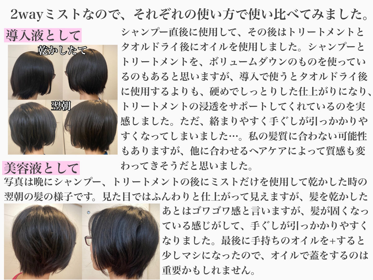 | ヘアケア・スタイリングランキング第106位 | ミストが細やかで全体に吹きかけやすい しっとりよりでは無くてサラサラ寄り | 詳細を見る | |