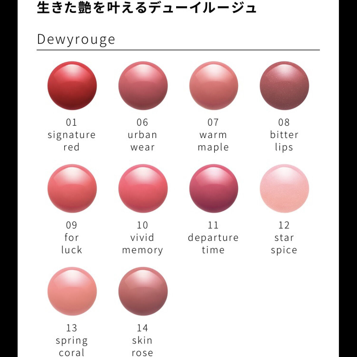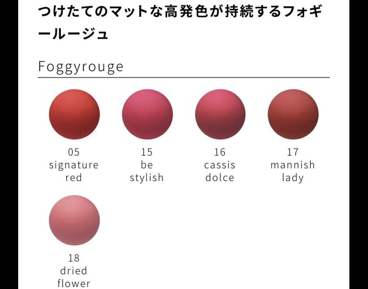 - ç¡æèã«ãçŸããã€ã¥ãã 軜ããã§å¿å°ããã è¶ãšãããã®ã¹ãã³ã±ã¢ã«ãŒãžã¥ã ç¬èªã®ãã¯ãããžãŒã§âèãçŸããé ããâããšã«ãã ããã èªãããšã³ãã¯ãŒãããããªè±å¯ãªã«ã©ãŒå±éã® ãã«ãŒãžã¥ ãã³ã«ããããã åã«çºãããã ããã£ãšè»œãããªããããã«æºãããç¶ãããããªå¿å°ããã® ãã«ãŒãžã¥ ãã³ã«ã ãªãããããèªçããŸãã ã³ã¹ã¡ãã³ã«ããªãã§ã¯ã®ã ãããããšåœ©ããé·æéæç¶ããã ããã€ããã©ãŒãã³ã¹ã«ãã»ã«åŠæ¹ããæ¡çšãã é«ãã©ã¹ãã£ã³ã°å¹æãå®çŸã åãžã®å¿å°ãããšå¡ããããã«ãã ãã£ãå¹³å圢ç¶ã®ãããã§ã ã²ãšå¡ãã§çŸããåäžãªå¡åžèãå¶ããŸãã Dewy rouge (ãã¥ãŒã€ ã«ãŒãžã¥ ) çŽ ã®åãšäžäœåãããããªãçããè¶ã ã¿ãã¿ããã軜ãããªã¿ããã§æ¿å¯ãªçºè²ãå¶ãã çŸããä»äžãããšå¿å°ãããç¶ããªãããã«ãŒãžã¥ã 01 signature red / 06 urban wear / 07 warm maple / 08 bitter lips / 09 for luck / 10 vivid memory / 11 departure time / 12 star spice /13 spring coral /14 skin rose Foggy rougeïŒãã©ã®ãŒ ã«ãŒãžã¥ïŒ 50ç§ã§ãäºæ¬¡ä»çã¬ã¹ã å æ¹¿ãããŠãããããªå¿å°ããã§åã圩ãã ã€ãããŠã®ããããªé«çºè²ãæç¶ããã ãã©ã³ã¹ãã¡ãŒãã«ãŒãã®ãªãããã«ãŒãžã¥ã 05 signature red / 15 be stylish / 16 cassis dolce /17 mannish lady / 18 dried flower