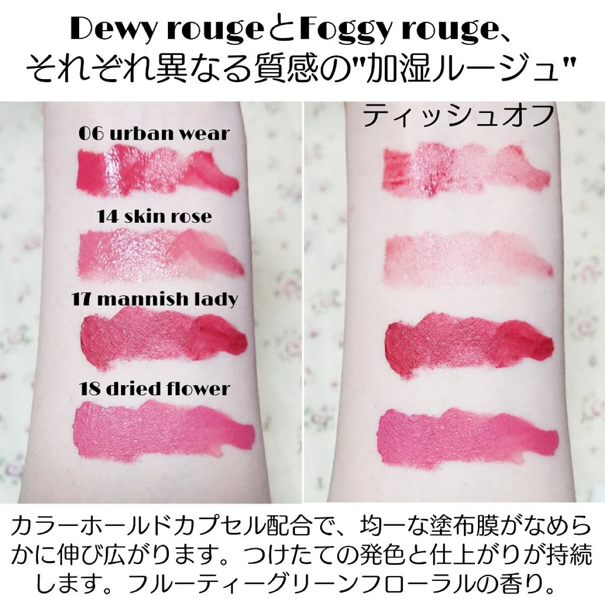 - <01 signature red(Dewy rouge )> ヘキサ(ヒドロキシステアリン酸/ステアリン酸/ロジン酸)ジペンタエリスリチル、トリメチルシロキシケイ酸、イソドデカン、ジフェニルシロキシフェニルトリメチコン、ジカプリン酸ネオペンチルグリコール、マイクロクリスタリンワックス、リンゴ酸ジイソステアリル、トリイソステアリン酸ポリグリセリル-2、ジフェニルジメチコン、水添ポリイソブテン、ラウロイルグルタミン酸ジ(オクチルドデシル/フィトステリル/ベヘニル)、(エチレン/プロピレン)コポリマー、ジメチルシリル化シリカ、パルミチン酸デキストリン、ジステアルジモニウムヘクトライト、アストロカリウムムルムル種子脂、ゼニアオイエキス、ダマスクバラ花エキス、トコフェロール、マツリカ花エキス、レモン果実エキス、BG、BHT、DPG、PEG-9ポリジメチルシロキシエチルジメチコン、エタノール、キサンタンガム、シリカ、ジイソステアリン酸ポリグリセリル-2、ジメチコン、スクワラン、ハイドロゲンジメチコン、パーフルオロヘキシルエチルトリエトキシシラン、ホウケイ酸(Ca/Al)、ミネラルオイル、メタクリル酸メチルクロスポリマー、メチコン、ラウリルPEG-9ポリジメチルシロキシエチルジメチコン、レシチン、水、水酸化Al、炭酸Ca、麻セルロース、フェノキシエタノール、香料、オキシ塩化ビスマス、マイカ、酸化チタン、酸化鉄、黄4、赤202 <05 signature red(Foggy rouge)> イソドデカン、トリメチルシロキシケイ酸、合成ワックス、ジカプリン酸ネオペンチルグリコール、合成金雲母、ワセリン、(エチレン/プロピレン)コポリマー、シリカ、エチルヘキサン酸セチル、ジメチコン、アストロカリウムムルムル種子脂、ゼニアオイエキス、ダマスクバラ花エキス、トコフェロール、マツリカ花エキス、レモン果実エキス、BG、BHT、DPG、PEG-9ポリジメチルシロキシエチルジメチコン、エタノール、キサンタンガム、ジイソステアリン酸ポリグリセリル-2、ジステアルジモニウムヘクトライト、スクワラン、パーフルオロヘキシルエチルトリエトキシシラン、パルミチン酸デキストリン、ホウケイ酸(Ca/Al)、ミネラルオイル、メタクリル酸メチルクロスポリマー、ラウリルポリグリセリル-3ポリジメチルシロキシエチルジメチコン、レシチン、水、水酸化Al、炭酸Ca、麻セルロース、フェノキシエタノール、香料、オキシ塩化ビスマス、マイカ、酸化チタン、酸化鉄、黄4、赤202 <06 urban wear(Dewy rouge )> ヘキサ(ヒドロキシステアリン酸/ステアリン酸/ロジン酸)ジペンタエリスリチル、トリメチルシロキシケイ酸、イソドデカン、ジフェニルシロキシフェニルトリメチコン、ジカプリン酸ネオペンチルグリコール、マイクロクリスタリンワックス、リンゴ酸ジイソステアリル、トリイソステアリン酸ポリグリセリル-2、ジフェニルジメチコン、水添ポリイソブテン、ラウロイルグルタミン酸ジ(オクチルドデシル/フィトステリル/ベヘニル)、(エチレン/プロピレン)コポリマー、ジメチルシリル化シリカ、パルミチン酸デキストリン、ジステアルジモニウムヘクトライト、アストロカリウムムルムル種子脂、ゼニアオイエキス、ダマスクバラ花エキス、トコフェロール、マツリカ花エキス、レモン果実エキス、BG、BHT、DPG、PEG-9ポリジメチルシロキシエチルジメチコン、エタノール、キサンタンガム、シリカ、ジイソステアリン酸ポリグリセリル-2、ジメチコン、スクワラン、ハイドロゲンジメチコン、パーフルオロヘキシルエチルトリエトキシシラン、ホウケイ酸(Ca/Al)、ミネラルオイル、メタクリル酸メチルクロスポリマー、メチコン、ラウリルPEG-9ポリジメチルシロキシエチルジメチコン、レシチン、水、水酸化Al、炭酸Ca、麻セルロース、フェノキシエタノール、香料、オキシ塩化ビスマス、マイカ、酸化チタン、酸化鉄、黄4、赤202 <08 bitter lips(Dewy rouge )> ヘキサ(ヒドロキシステアリン酸/ステアリン酸/ロジン酸)ジペンタエリスリチル、トリメチルシロキシケイ酸、イソドデカン、ジフェニルシロキシフェニルトリメチコン、ジカプリン酸ネオペンチルグリコール、マイクロクリスタリンワックス、トリイソステアリン酸ポリグリセリル-2、リンゴ酸ジイソステアリル、ジフェニルジメチコン、水添ポリイソブテン、ラウロイルグルタミン酸ジ(オクチルドデシル/フィトステリル/ベヘニル)、(エチレン/プロピレン)コポリマー、ジメチルシリル化シリカ、パルミチン酸デキストリン、ジステアルジモニウムヘクトライト、アストロカリウムムルムル種子脂、ゼニアオイエキス、ダマスクバラ花エキス、トコフェロール、マツリカ花エキス、レモン果実エキス、BG、BHT、DPG、PEG-9ポリジメチルシロキシエチルジメチコン、エタノール、キサンタンガム、シリカ、ジイソステアリン酸ポリグリセリル-2、ジメチコン、スクワラン、ハイドロゲンジメチコン、パーフルオロヘキシルエチルトリエトキシシラン、ホウケイ酸(Ca/Al)、ミネラルオイル、メタクリル酸メチルクロ