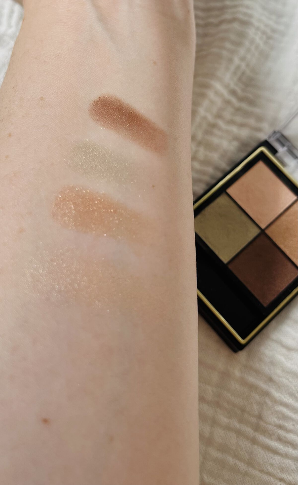 - 1.重ねてもくすまないクリアな発色。ナチュラルに溶け合う絶妙4カラー。 ツヤタイプ(左上・左下カラー):アイホール全体にぼかしたり、目尻へのポイント使いも。 ラメタイプ(右上カラー):アイホール中心や下まぶたにきらめきのアクセント。 マットタイプ(右下カラー):単色で陰影を付けたり、ツヤタイプと重ねてニュアンスをプラス。 2.うっとりするほどリッチな質感で粉飛びしないのに、軽いタッチで伸びて重ねやすいテクスチャー。 3.スクワラン(保湿)配合で目元の乾燥を防ぎます。 [PERFORMANCE] 色と質感の重ね着を楽しむ、ファッション感覚アイシャドウパレット [DESIGN] ・まぶたにひっかからない、なめらかな上質チップ ・薄型コンパクトだからポーチの中でかさばらない [QUALITY] 1.重ねてもくすまないクリアな発色 ナチュラルに溶け合う絶妙4カラー 2.パールの重ね技でまぶたに極上のツヤ感 微細多色 カラーパール 銀コーティング ガラスパール* excel GOLD-MIX処方(金パール配合)* (*右上のシャイニーカラーのみ) 3.うっとりするほどリッチな質感で粉飛び知らず!なのに、軽いタッチで伸びて重ねやすい 4.スクワラン(保湿)配合で目元の乾燥を防ぐ