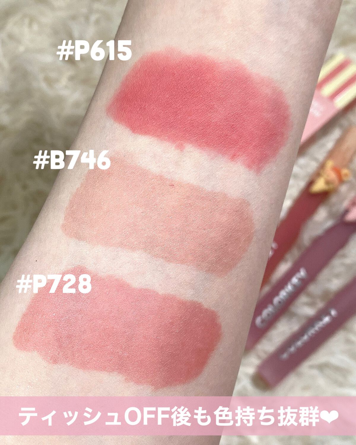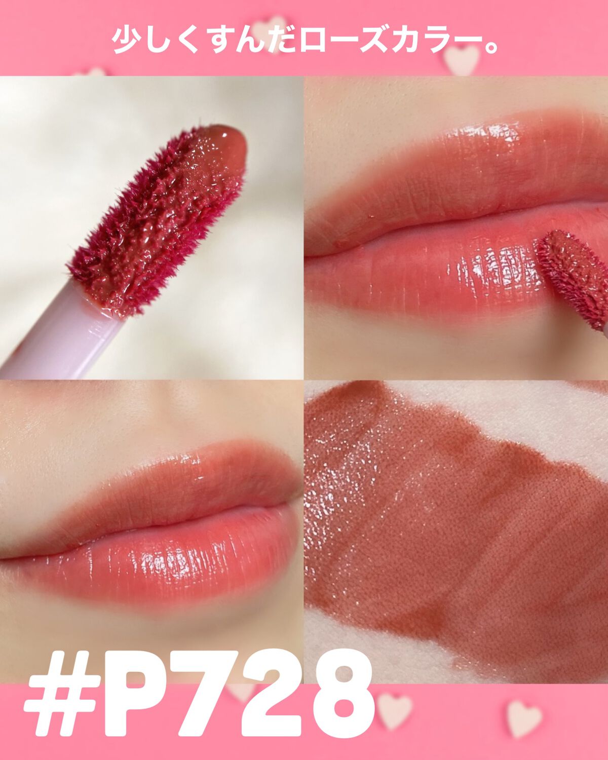 パケの可愛さに惹かれて購入〜! 私が買ったときは3色残ってて、全部欲しいのを我慢して「P747 ローズライチ」をチョイス! 透け感のあるローズピンクで、くすみっぽさもあるよ。けっこう薄付きな気がしてて唇の色ムラは完全にカバーできはしないんだけどちょうどいい立体感になって良いかも🤔 テクスチャーはちゅるっと軽めのタイプでベタつかない◎ 乾燥の季節にもネチョつかずに使えそう♡