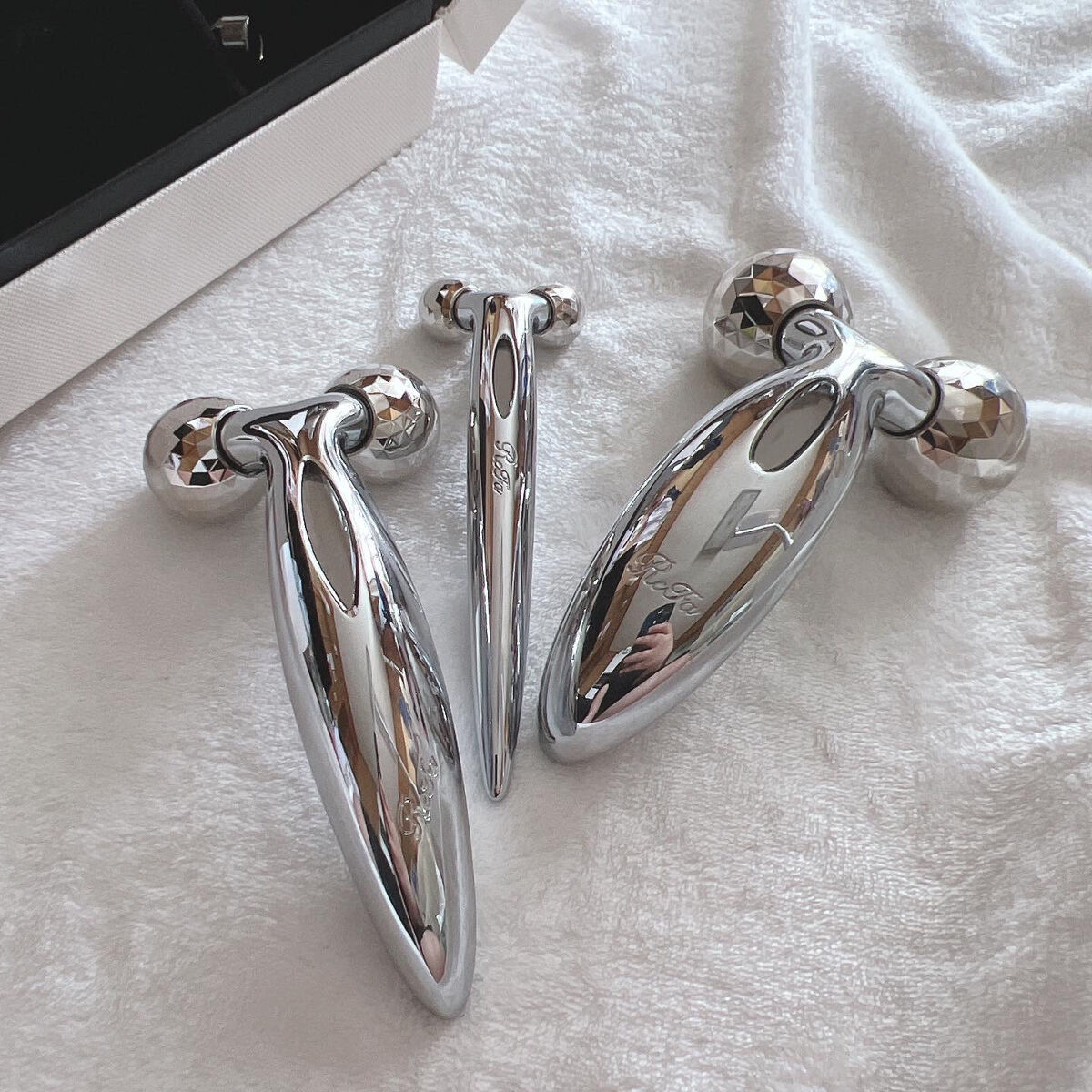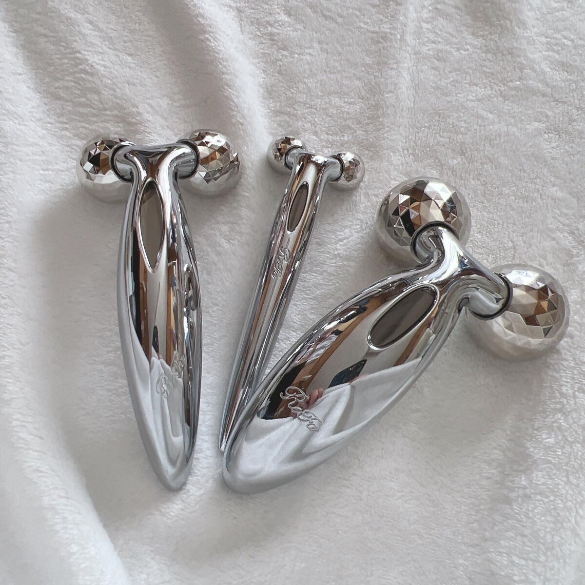 - プラチナの輝き、優雅な曲線の先端に配したのは、起伏に富んだ顔のカーブにもフィットする360°マルチアングル構造のローラー。 女性の顔・デコルテ専用に設計された、しなやかに手になじむコンパクトなローラーが、エステティシャンの繊細な指先のように深くつまみ流す動きでデリケートな女性の肌を美しく引き締めます。