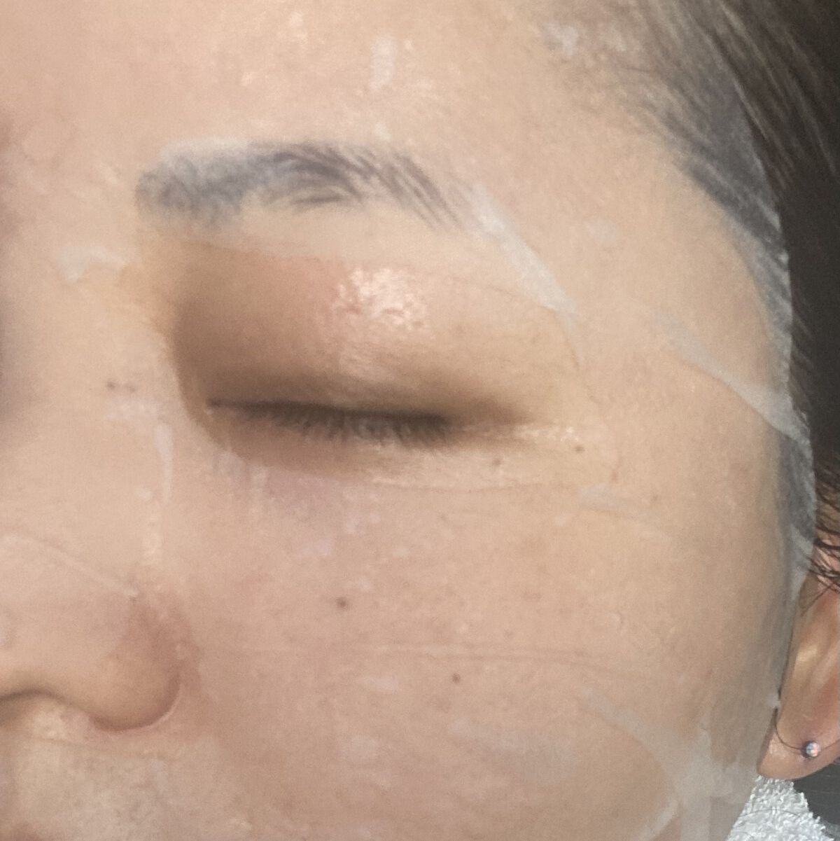 | シワも出来ずにぴたーっと密着。顔との一体感がすごい!そして液がヒタヒタなのに垂れてこない! | 詳細を見る | ||