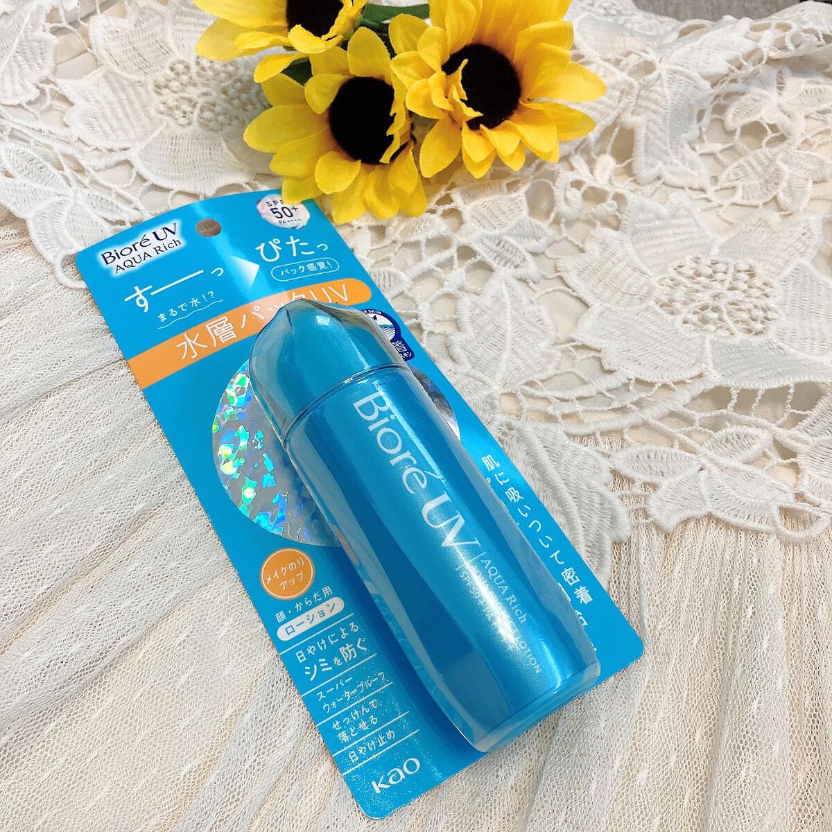 ビオレUVアクアリッチアクアプロテクトローションを使ってみたよ🩵SPF50+PA++++顔とからだ両方使用可!メイクのりをUPさせてくれて、水光肌みたいなツヤ感も出るから気に入ってる🩵UVカット成分が含まれたアクアカプセルが入ってるよ✨想像よ...
