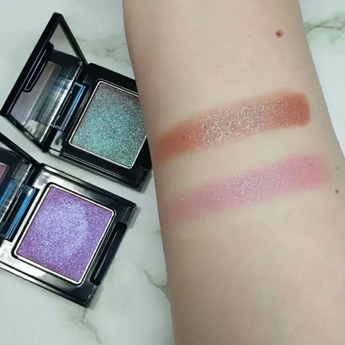 全色にパールとラメがふんだんに入っていて控えめな発色、上品な煌めきが美しい😍❤ 肌馴染みが良く、グラデーションも作りやすいので、どんなに重ね付けしても失敗しない❗ 柔らかめな粉質はしっとりとして密着度が高く、粉飛びもラメ飛びもしません‼ 上品なツヤと輝きは流石👏👏👏❤