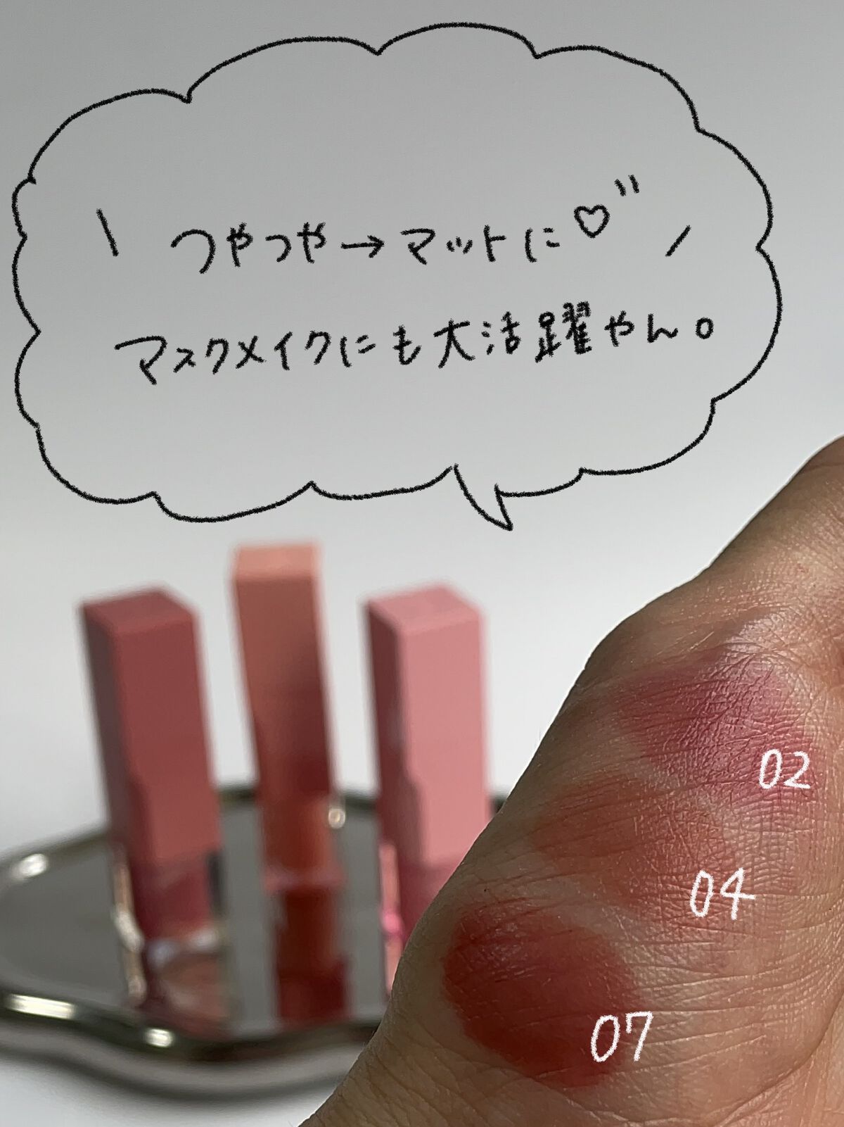 塗りたてはツヤ系、時間経過でマットっぽくなるティントリップ。塗ってすぐティッシュオフでも色がしっかりついたままマットっぽくなります。 数回使用しましたが今の所唇の皮剥けがなく快適です。