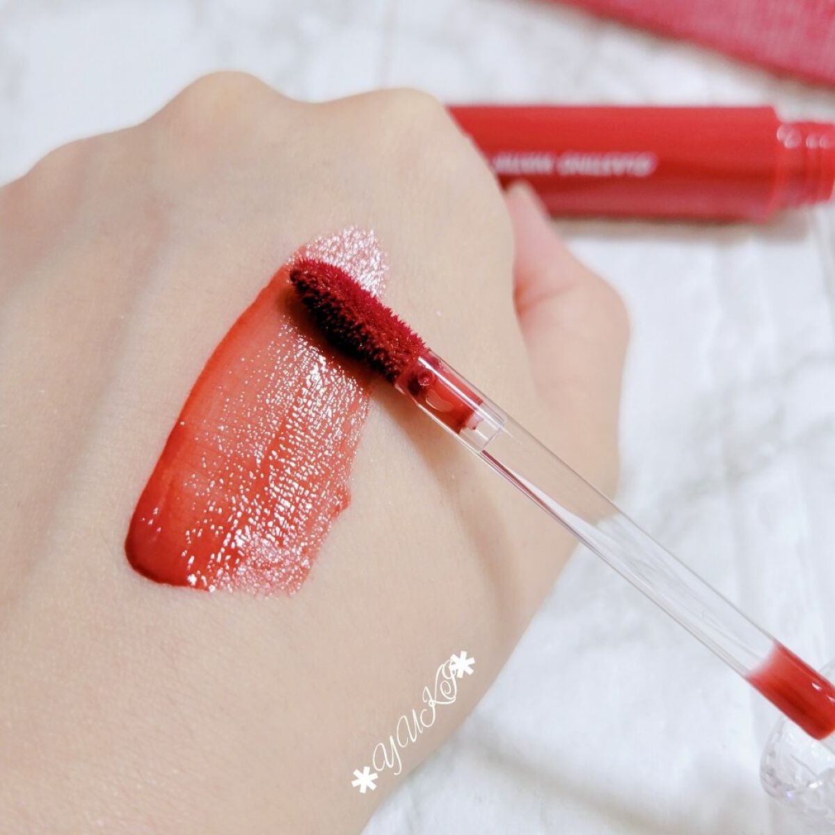 - 透明に輝くウォーターカバーを唇に乗せる ①カラーと光沢層が分離されているので透明感アップ #水膜ティント ②ウォーターティント並みの #色づき ③ベタつき感ゼロ、潤いだけを残す #ちゅるんとリップティント