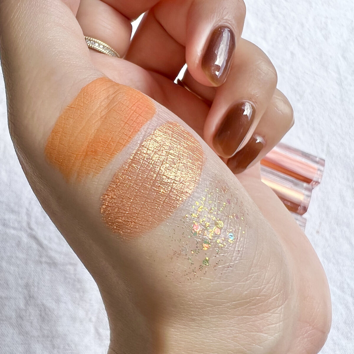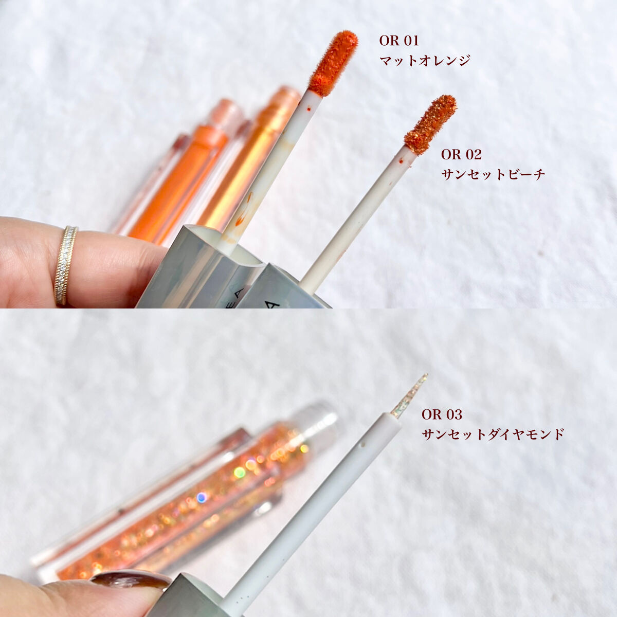 よくパレットのなかで明るいカラーをベースにまぶたに広く塗ることが多いのですが、パール感のあるカラーを避ける🙆♀️! パール感たっぷりの明るいカラーは涙袋に使うぐらい光を集めてぷっくり見せてくれるので、まぶたに広く使うと腫れぼったく見えがち😓 目元を明るくみせてくれたり、次に使うアイシャドウをぼかしやすくしてくれるけど、すっ飛ばしてメインのカラーを塗っちゃう✊🏻❤️🔥 涙袋にはたっぷり塗ってぷっくり見せる🙆♀️💕 シルキースフレアイズのマットタイプはすごく優れているな〜と感じました☺️💗 赤やオレンジなどは、入れすぎると腫れぼったく見えやすいので、見せたいカラーは下まぶた目尻にのせて色をたのしむ♡♡ パール感なしの透けマットだけじゃ物足りない… そう感じさせない華やかなラメが左上に入っているので黒目上と涙袋にのせるとすごく可愛い仕上がりに😍! 厄介な左右差のお陰でマットアイシャドウが好きになりました😌💕