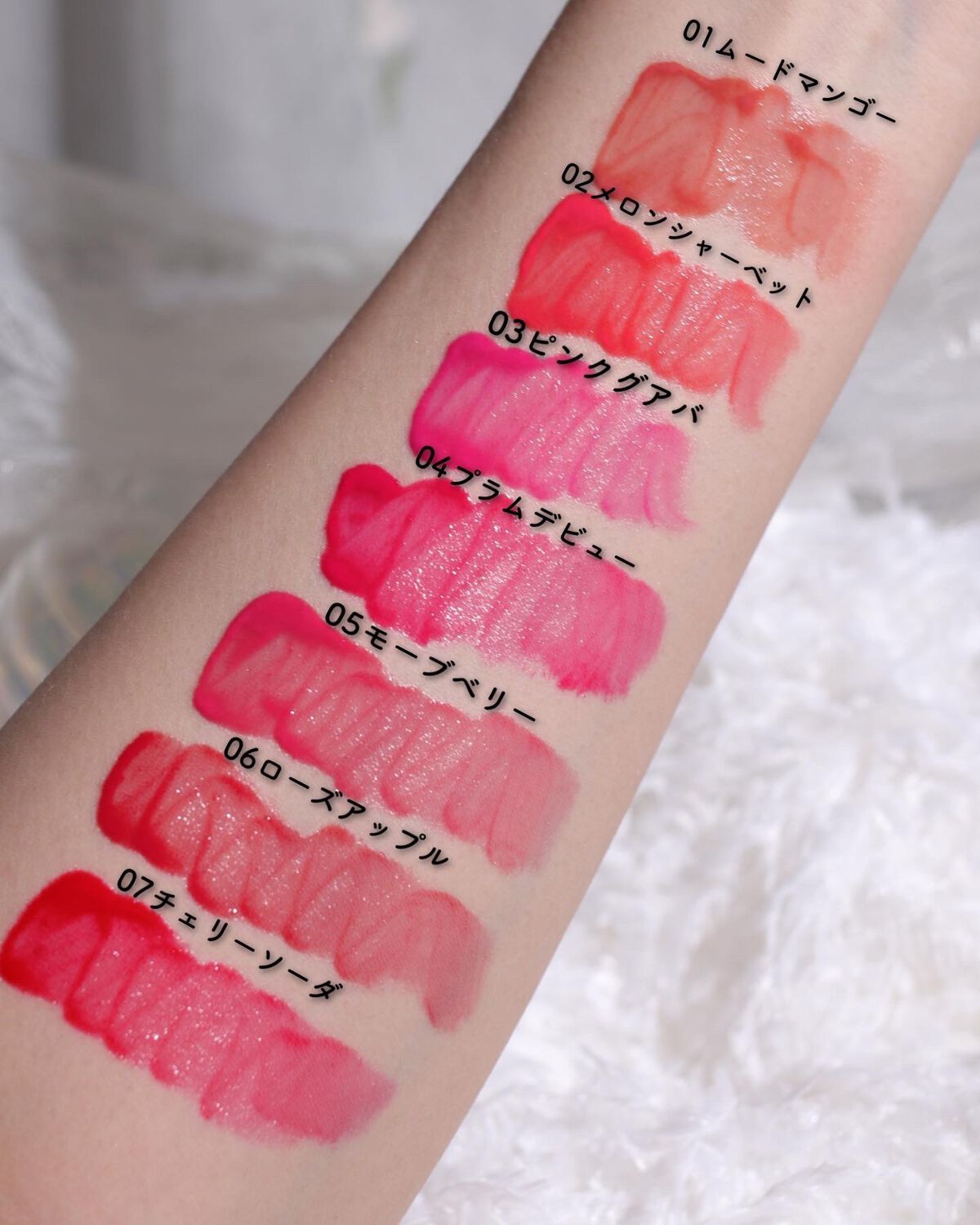 - <01 ムードマンゴー> 水、ジフェニルジメチコン、リンゴ酸ジイソステアリル、ビスジグリセリルポリアシルアジペート-2、ジグリセリン、水添ポリイソブテン、ダイマージリノール酸(フィトステリル/イソステアリル/セチル/ステアリル/ベヘニル)、ポリソルベート60、セチルPEG/PPG-10/1ジメチコン、DPG、ポリフェニルシルセスキオキサン、イソステアリン酸ソルビタン、ダイマージリノール酸ジイソステアリン酸ポリグリセリル-3、1,2-ヘキサンジオール、オクチルドデカノール、トリ(カプリル酸/カプリン酸)グリセリル、(アクリル酸ヒドロキシエチル/アクリロイルジメチルタウリンNa)コポリマー、セテアリルアルコール、酸化チタン、スクワラン、フェノキシエタノール、赤102、安息香酸ベンジル、エチルヘキシルグリセリン、黄4、香料、赤104(1)、水酸化Al、黄5、ポリアクリル酸アンモニウム、リナロール、BG、青1、塩化Na、ヘキシルシンナマル、トコフェロール <02 メロンシャーベット> 水、ジフェニルジメチコン、リンゴ酸ジイソステアリル、ビスジグリセリルポリアシルアジペート-2、ジグリセリン、水添ポリイソブテン、ダイマージリノール酸(フィトステリル/イソステアリル/セチル/ステアリル/ベヘニル)、ポリソルベート60、セチルPEG/PPG-10/1ジメチコン、DPG、ポリフェニルシルセスキオキサン、イソステアリン酸ソルビタン、ダイマージリノール酸ジイソステアリン酸ポリグリセリル-3、1,2-ヘキサンジオール、オクチルドデカノール、トリ(カプリル酸/カプリン酸)グリセリル、酸化チタン、(アクリル酸ヒドロキシエチル/アクリロイルジメチルタウリンNa)コポリマー、セテアリルアルコール、スクワラン、フェノキシエタノール、赤102、黄4、安息香酸ベンジル、エチルヘキシルグリセリン、赤104(1)、香料、水酸化Al、ポリアクリル酸アンモニウム、赤227、リナロール、BG、塩化Na、ヘキシルシンナマル、トコフェロール <03 ピンクグアバ> 水、ジフェニルジメチコン、リンゴ酸ジイソステアリル、ビスジグリセリルポリアシルアジペート-2、ジグリセリン、水添ポリイソブテン、ダイマージリノール酸(フィトステリル/イソステアリル/セチル/ステアリル/ベヘニル)、ポリソルベート60、セチルPEG/PPG-10/1ジメチコン、DPG、ポリフェニルシルセスキオキサン、イソステアリン酸ソルビタン、ダイマージリノール酸ジイソステアリン酸ポリグリセリル-3、1,2-ヘキサンジオール、オクチルドデカノール、トリ(カプリル酸/カプリン酸)グリセリル、(アクリル酸ヒドロキシエチル/アクリロイルジメチルタウリンNa)コポリマー、セテアリルアルコール、スクワラン、フェノキシエタノール、酸化チタン、赤104(1)、安息香酸ベンジル、エチルヘキシルグリセリン、黄5、香料、水酸化Al、ポリアクリル酸アンモニウム、リナロール、赤227、BG、青1、ヘキシルシンナマル、トコフェロール <04 プラムデュー> 水、ジフェニルジメチコン、リンゴ酸ジイソステアリル、ビスジグリセリルポリアシルアジペート-2、ジグリセリン、水添ポリイソブテン、ダイマージリノール酸(フィトステリル/イソステアリル/セチル/ステアリル/ベヘニル)、ポリソルベート60、セチルPEG/PPG-10/1ジメチコン、DPG、ポリフェニルシルセスキオキサン、イソステアリン酸ソルビタン、ダイマージリノール酸ジイソステアリン酸ポリグリセリル-3、1,2-ヘキサンジオール、オクチルドデカノール、トリ(カプリル酸/カプリン酸)グリセリル、(アクリル酸ヒドロキシエチル/アクリロイルジメチルタウリンNa)コポリマー、セテアリルアルコール、酸化チタン、スクワラン、フェノキシエタノール、赤104(1)、黄5、赤227、安息香酸ベンジル、エチルヘキシルグリセリン、香料、黄4、水酸化Al、ポリアクリル酸アンモニウム、リナロール、BG、ヘキシルシンナマル、塩化Na、トコフェロール <05 モーブベリー> 水、ジフェニルジメチコン、リンゴ酸ジイソステアリル、ビスジグリセリルポリアシルアジペート-2、ジグリセリン、水添ポリイソブテン、ダイマージリノール酸(フィトステリル/イソステアリル/セチル/ステアリル/ベヘニル)、ポリソルベート60、セチルPEG/PPG-10/1ジメチコン、DPG、ポリフェニルシルセスキオキサン、イソステアリン酸ソルビタン、ダイマージリノール酸ジイソステアリン酸ポリグリセリル-3、1,2-ヘキサンジオール、オクチルドデカノール、トリ(カプリル酸/カプリン酸)グリセリル、(アクリル酸ヒドロキシエチル/アクリロイルジメチルタウリンNa)コポリマー、セテアリルアルコール、酸化チタン、スクワラン、フェノキシエタノール、赤227、黄5、安息香酸ベンジル、エチルヘキシルグリセリン、香料、水酸化Al、ポリアクリル酸アンモニウム、リナロール、黄4、BG、ヘキシルシンナマル、塩化Na、トコフェロール <06 ローズアップル> 水、ジフェニルジメチコン、リンゴ酸ジイソステアリル、ビスジグリセリルポリアシルアジペート-2、ジグリセリン、水添ポリイソブテン、ダイマージリノー