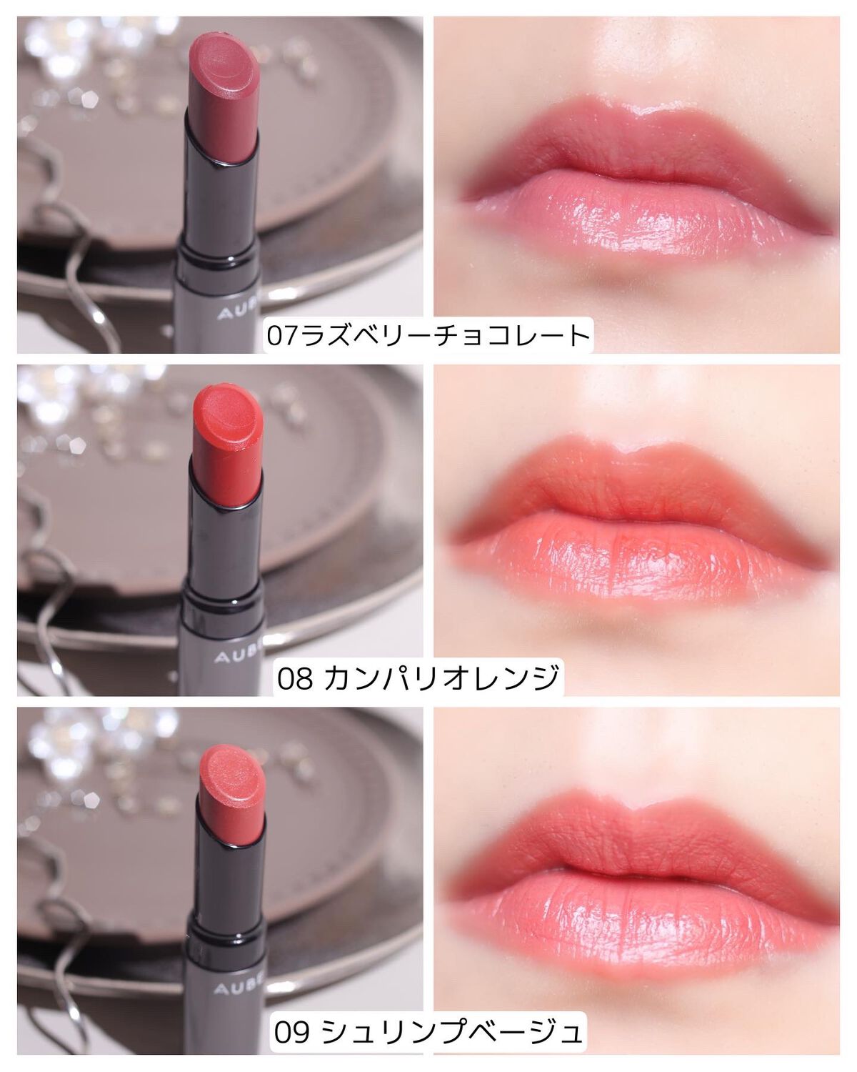 - <01> リンゴ酸ジイソステアリル、テトライソステアリン酸ジペンタエリスリチル、イソノナン酸イソトリ デシル、オクチルドデカノール、水添ポリイソブテン、ジカプリン酸ネオペンチルグリコール、ヘキサヒド ロキシステアリン酸ジペンタエリスリチル、ビスアルキル(C16-18)グリセリルウンデシルジメチコン、パ ラフィン、(ベヘン酸/ポリヒドロキシステアリン酸)ペンタエリスリチル、合成ワックス、マイクロクリスタ リンワックス、セレシン、メトキシケイヒ酸エチルヘキシル、PEG-12ジメチコン、ラウロイルグルタミン酸 ジ(オクチルドデシル/フィトステリル/ベヘニル)、パルミトイルヒドロキシプロピルセルロース、ジステ アルジモニウムヘクトライト、スクワラン、炭酸プロピレン、酢酸トコフェロール、BHT、グリチルレチン酸 ステアリル、シメチコン、カミツレ花エキス、(+/-)セルロース、パルミチン酸、マイカ、ラウロイルアスパ ラギン酸Na、塩化亜鉛、酸化チタン、酸化鉄、水酸化Al、硫酸Ba、トリイソステアリン酸イソプロピル チタン、トリエトキシカプリリルシラン、合成フルオロフロゴパイト、黄4、青1、赤104(1)、赤201、赤202 <02> テトライソステアリン酸ジペンタエリスリチル、イソノナン酸イソトリデシル、オクチルドデカノール、リン ゴ酸ジイソステアリル、水添ポリイソブテン、ジカプリン酸ネオペンチルグリコール、ヘキサヒドロキシステア リン酸ジペンタエリスリチル、ビスアルキル(C16-18)グリセリルウンデシルジメチコン、パラフィン、(ベヘ ン酸/ポリヒドロキシステアリン酸)ペンタエリスリチル、合成ワックス、ラウロイルグルタミン酸ジ(オクチ ルドデシル/フィトステリル/ベヘニル)、マイクロクリスタリンワックス、セレシン、メトキシケイヒ酸エチル ヘキシル、PEG-12ジメチコン、パルミトイルヒドロキシプロピルセルロース、ジステアルジモニウムヘクトラ イト、ヒドロキシステアリン酸エチルヘキシル、スクワラン、炭酸プロピレン、酢酸トコフェロール、BHT、グリチ ルレチン酸ステアリル、シメチコン、カミツレ花エキス、(+/-)セルロース、パルミチン酸、マイカ、ラウロ イルアスパラギン酸Na、塩化亜鉛、酸化チタン、酸化鉄、水酸化Al、硫酸Ba、トリイソステアリン酸イソプ ロピルチタン、トリエトキシカプリリルシラン、合成フルオロフロゴパイト、黄4、黄5、赤104(1)、赤201、赤202 <03> リンゴ酸ジイソステアリル、テトライソステアリン酸ジペンタエリスリチル、イソノナン酸イソトリ デシル、オクチルドデカノール、水添ポリイソブテン、ジカプリン酸ネオペンチルグリコール、ヘキサヒド ロキシステアリン酸ジペンタエリスリチル、ビスアルキル(C16-18)グリセリルウンデシルジメチコン、パ ラフィン、(ベヘン酸/ポリヒドロキシステアリン酸)ペンタエリスリチル、合成ワックス、マイクロクリスタ リンワックス、セレシン、メトキシケイヒ酸エチルヘキシル、PEG-12ジメチコン、ラウロイルグルタミン酸 ジ(オクチルドデシル/フィトステリル/ベヘニル)、パルミトイルヒドロキシプロピルセルロース、ジステ アルジモニウムヘクトライト、スクワラン、炭酸プロピレン、酢酸トコフェロール、BHT、グリチルレチン酸 ステアリル、シメチコン、カミツレ花エキス、(+/-)セルロース、パルミチン酸、マイカ、ラウロイルアスパ ラギン酸Na、塩化亜鉛、酸化チタン、酸化鉄、水酸化Al、硫酸Ba、トリイソステアリン酸イソプロピル チタン、トリエトキシカプリリルシラン、合成フルオロフロゴパイト、黄4、青1、赤104(1)、赤201、赤202 <05> リンゴ酸ジイソステアリル、テトライソステアリン酸ジペンタエリスリチル、イソノナン酸イソトリ デシル、オクチルドデカノール、水添ポリイソブテン、ジカプリン酸ネオペンチルグリコール、ヘキサヒド ロキシステアリン酸ジペンタエリスリチル、ビスアルキル(C16-18)グリセリルウンデシルジメチコン、パ ラフィン、(ベヘン酸/ポリヒドロキシステアリン酸)ペンタエリスリチル、合成ワックス、マイクロクリスタ リンワックス、セレシン、メトキシケイヒ酸エチルヘキシル、PEG-12ジメチコン、ラウロイルグルタミン酸 ジ(オクチルドデシル/フィトステリル/ベヘニル)、パルミトイルヒドロキシプロピルセルロース、ジステ アルジモニウムヘクトライト、スクワラン、炭酸プロピレン、酢酸トコフェロール、BHT、グリチルレチン酸 ステアリル、シメチコン、カミツレ花エキス、(+/-)セルロース、パルミチン酸、マイカ、ラウロイルアスパ ラギン酸Na、塩化亜鉛、酸化チタン、酸化鉄、水酸化Al、硫酸Ba、トリイソステアリン酸イソプロピル チタン、トリエトキシカプリリルシラン、合成フルオロフロゴパイト、黄4、青1、赤104(1)、赤201、赤202 <07 ラズベリーチョコレート> テトライソステアリン酸ジペンタエリスリチル、イソノナン酸イソトリデシル、オクチルドデカノール、水添ポリイソブテン、ジカプリン酸ネオペンチルグリコール、リンゴ酸ジイソ