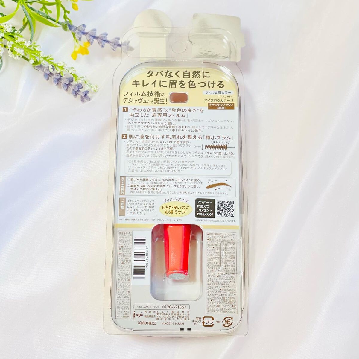 - \\25年3月定番新色モカグレージュ発売// 「フィルム眉カラー」なら眉の印象を自然にやわらげ、ふんわり質感の垢抜け眉に! 1.塗りやすい極小ブラシ ・ 先端直径3mmで、地肌に液がつきにくく根元から色づける ・余分な液がつかない設計で、ティッシュオフ不要 2.眉専用フィルム液 ・眉毛1本1本にキレイに色付き、自眉の黒さをやわらげる ・タバになったり、パリッと固まったりせず、まるで自眉のような仕上がり ・皮脂・汗・こすれに強いのにお湯で簡単オフ (※2025年9月以降、商品パッケージをリニューアル。)