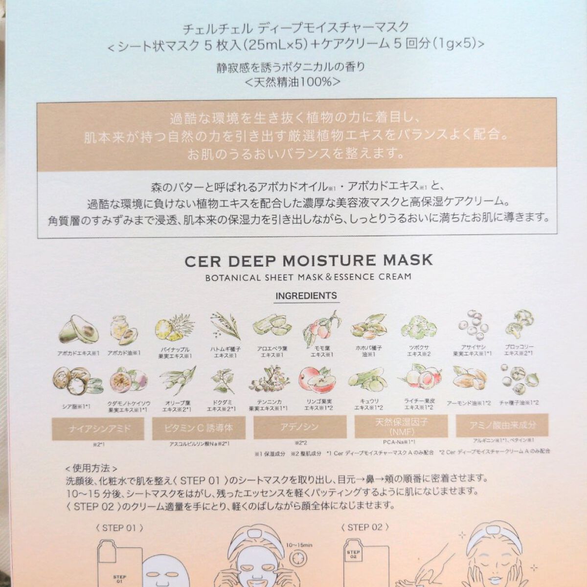 - Cer ディープモイスチャーマスク A 水、BG、グリセリン、1,2-ヘキサンジオール、ヒアルロン酸Na、アボカドエキス、アボカド油、パイナップル果実エキス、クダモノトケイソウ果実エキス、アサイヤシ果実エキス、テンニンカ果実エキス、モモ葉エキス、アロエベラ葉エキス、オリーブ葉エキス、ブロッコリーエキス、ハトムギ種子エキス、ツボクサエキス、ドクダミエキス、ホホバ種子油、ナイアシンアミド、アスコルビルリン酸Na、酢酸トコフェロール、ピリドキシンHCl、パントテン酸Ca、グリコシルトレハロース、ベタイン、シア脂、PCA-Na、ビスPEG-18メチルエーテルジメチルシラン、オクテニルコハク酸デンプンNa、マルトデキストリン、シリカ、オリーブ油脂肪酸セテアリル、オリーブ油脂肪酸ソルビタン、セスキオレイン酸ソルビタン、加水分解水添デンプン、ジメチコン、キサンタンガム、カルボマー、アルギニン、PEG-60水添ヒマシ油、フェノキシエタノール、EDTA-2Na、クスノキ樹皮油、オレンジ果皮油、イランイラン花油、ライム油、ジャスミン油、エンピツビャクシン油 Cer ディープモイスチャークリーム A 水、アロエベラ葉エキス、トリ(カプリル酸/カプリン酸)グリセリル、ペンチレングリコール、BG、スクワレン、ポリソルベート80、ヒアルロン酸Na、アボカドエキス、アボカド油、パイナップル果実エキス、ライチー果皮エキス、モモ葉エキス、ハトムギ種子エキス、ツボクサエキス、リンゴ果実エキス、キュウリエキス、ホホバ種子油、アーモンド油、チャ種子油、1,2-ヘキサンジオール、ベタイン、アラントイン、アデノシン、パンテノール、酢酸トコフェロール、パルミトイルペンタペプチド-4、(C13,14)イソパラフィン、トリステアリン酸ソルビタン、ポリアクリル酸Na、カプリル酸グリセリル、ジメチコン、ラウレス-7、セテアリルアルコール、EDTA-2Na、クスノキ樹皮油、オレンジ果皮油、イランイラン花油、ライム油、ジャスミン油、エンピツビャクシン油