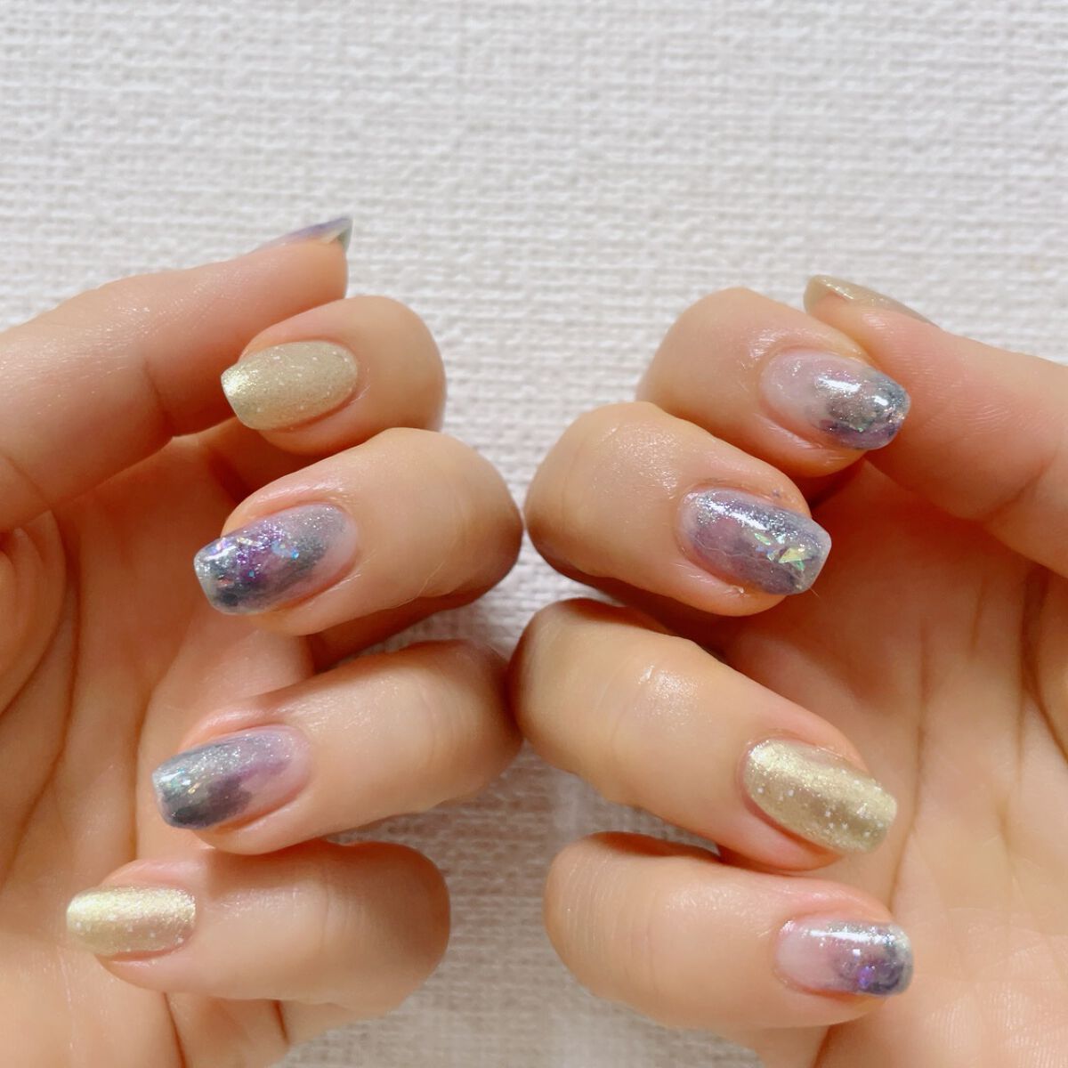 左手親指 薬指ネイルエス『夜間飛行』とADDICTION108P『Eve's Tears』をもやもや人差し指 小指ネイルエス『透明紅茶』とADDICTION108P中指ネイルエス『sakura drop』とADDICTION108P 『夜間飛行』はアレンジに使うと儚い感じになってとても良いです👏🏻✨✨ 適当に混ぜるだけなのですごく簡単☺️