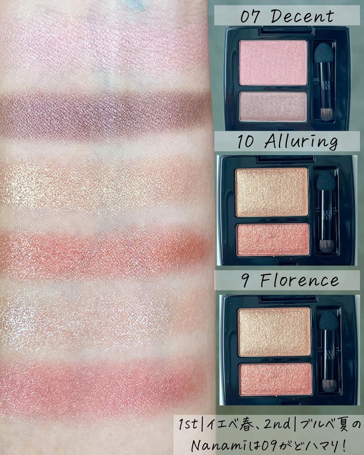SUQQUのアイシャドウはやはりまずイエベさんはこれをと言われるだけあってきれいで柔らかさのある温かみのある色味! キャンメイクに関してはよくシルキースフレアイズ 07ネクタリンオレンジが似てる色で比較をされたり、話題となってますが、個人的には昨秋発売となったマットタイプの方がより色味や質感仕上がりも近い印象です 07ネクタリンオレンジはシルキーな質感なのでかなりふんわり高密着なテクスチャー。そして色味が赤みのあるオレンジで、2ndがイエベのブルベさんなども使いやすい色味。 それに比べて SUQQUやマットタイプのシエナウッドは黄みによる色味なのでよりイエベさんが使いやすいかと思います!