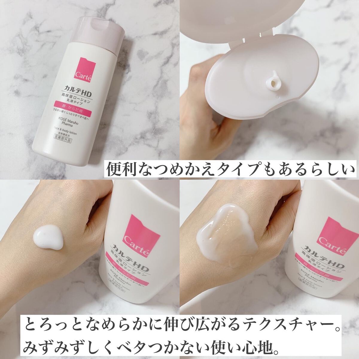 - 【高保湿フェイス&ボディローション】 顔にもからだにも。しっとりやわらか肌つづく。 信頼の保水有効成分「ヘパリン類似物質HD※」配合、低刺激処方の高機能フェイス&ボディローションです。 ヘパリン類似物質HDが、気温・湿度の変化で乾燥しやすいからだの肌のうるおい構造(角層ラメラ)を立て直し、しっとりやわらか肌に導きます。 2種のこだわりオイル配合で、しっとりするのにべたつかず、なめらかにのびひろがる使用感。敏感な肌でもまさつによるストレスがなく、全身をうるおいで満たします。 カルテHDシリーズとしては初めてお子さま(3歳以上)にもお使いいただける商品。 ・ボトルタイプ(220mL) ・ポンプタイプ(410mL) ・つめかえ用(370mL)の3種でラインアップ。 ご自身の保湿に、ご家族や大切なかたの保湿に。みずみずしくなめらかなうるおいが全身を包み込むフェイス&ボディローションです。 ※保水有効成分ヘパリン類似物質のこと <販売名:HD フェイスボディL>
