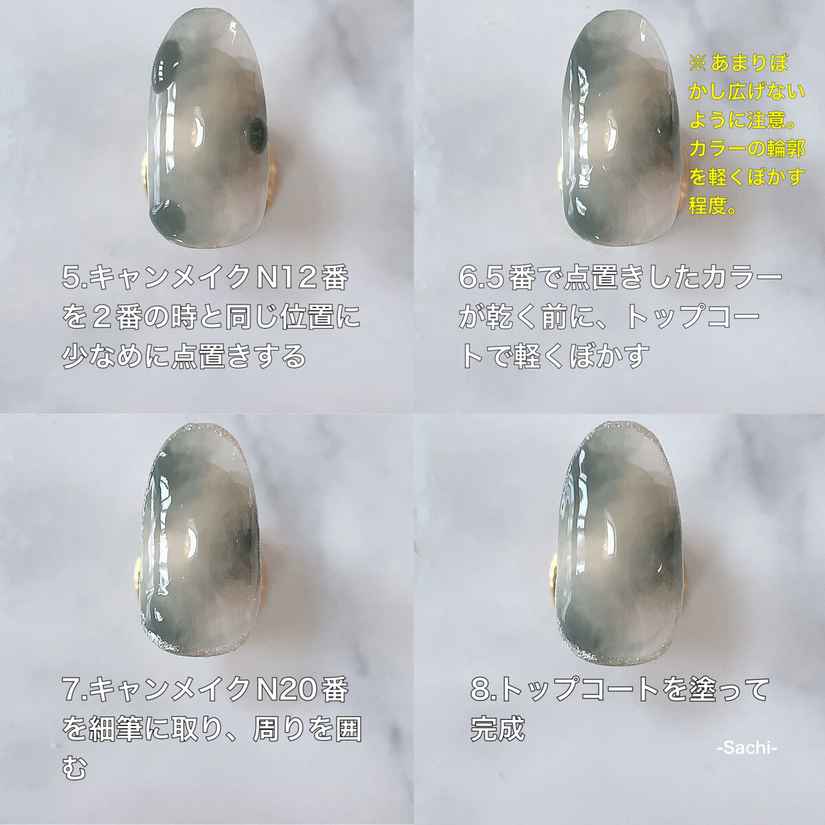 ワンカラーでも指ごとに色を変えるだけでオシャレに見えます💕 画像のようにゴールドラインとストーンを少し足すだけで華やかさがアップ🥰 何度かご紹介したことのあるスポンジで作るグラデーションです✨ スポンジを使うことで境目が綺麗に馴染んでくれます💕 アルミホイルの上でブラウンとトップコートを1:1くらいで混ぜたものを、トップコートのハケに取って3箇所に塗るだけ👌 事前に混ぜたものを塗ることで、爪の上でぼかすより簡単に出来ます💕 ベースカラーが乾く前に点置きしてぼかすことで綺麗にぼかせます✨ スピードが大事なので、使うポリッシュのキャップは全て開けておきましょう😊 天然石のラインはガタガタの方がより天然石っぽく見えるので、ラインを描くのが苦手な方でも大丈夫🙆♀️ 難しそうに見えて、やってみると意外と簡単に出来ます♡