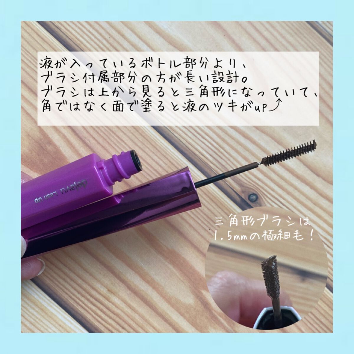 - ロングでもボリュームでもない、「自まつげを際立てる」という新発想 “見えないまつげ”も1本残らず際立てて、目ヂカラを最大限に引き出す 1.うぶ毛レベルの“見えないまつげ”も際立てる「高密着フィルム」 2.あらゆるまつげも1本残らず際立てる「超極細三角ブラシ」
