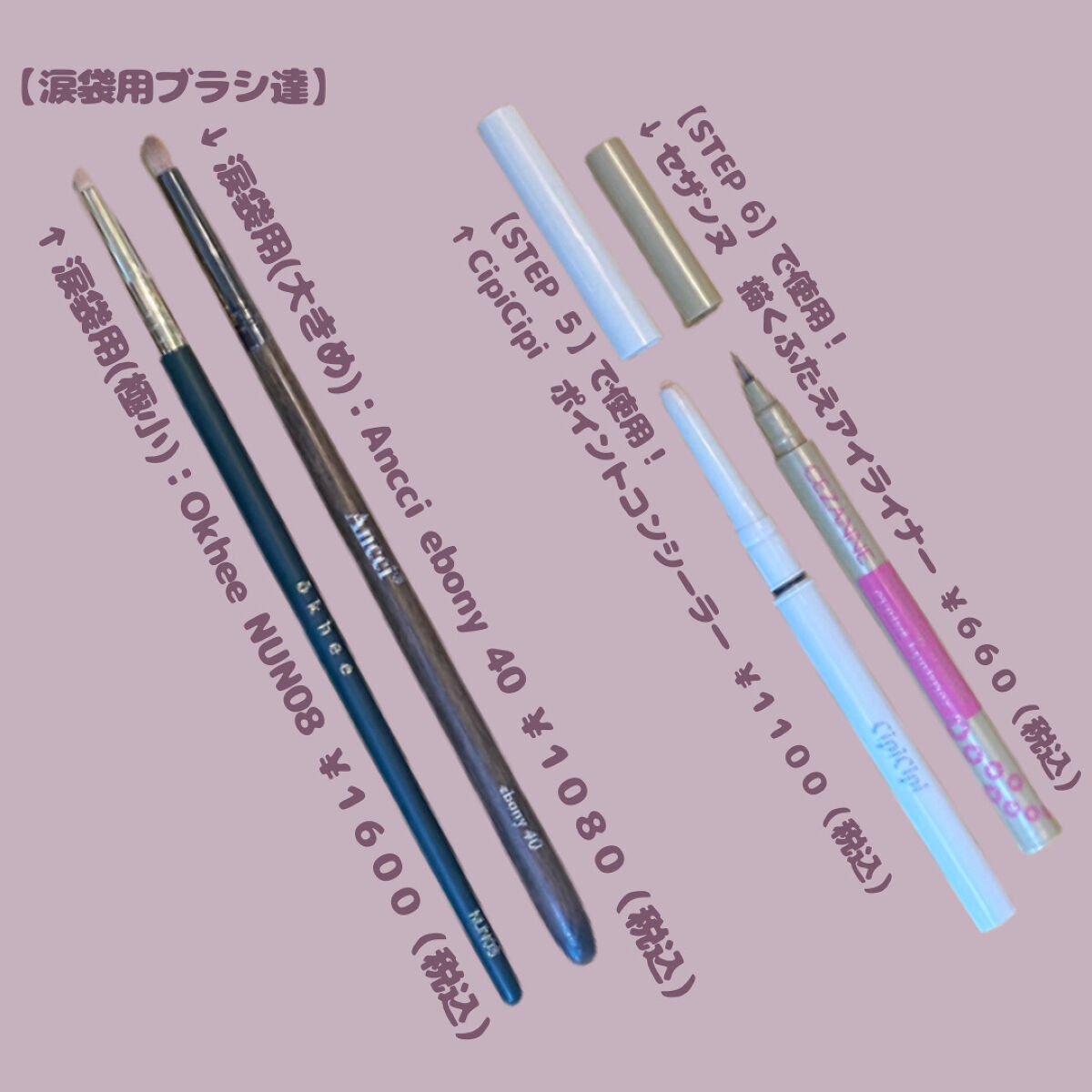 個人的に最近のお気に入りはthe SEAMのペンシルコンシーラーと CipiCipiのポイントコンシーラー🥹 涙袋(や目元)の皮膚は特に薄いので、「硬い」コンシーラーを毎日グリグリするのはあまりオススメしません… テクスチャーは緩めの方が、お肌に優しくてデイリー使いにはオススメです👍😢