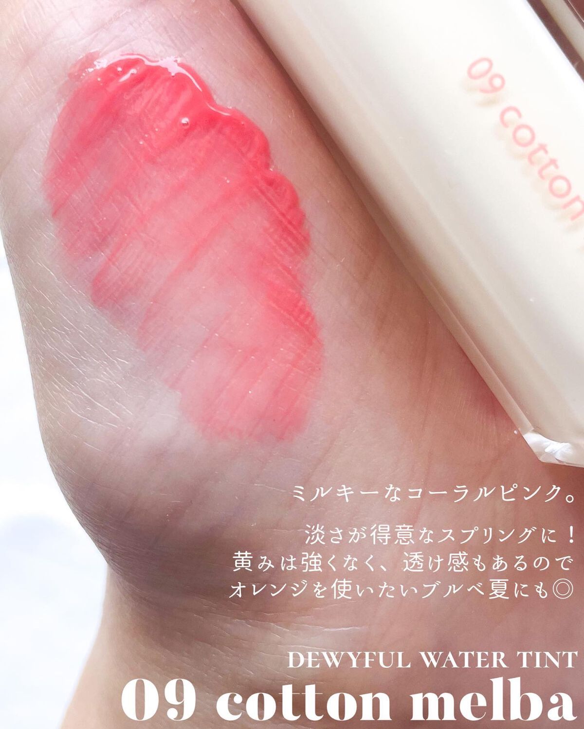 水みたいに軽いツヤツヤな仕上がり。 ベタベタしないし、付けてる感が少ないので快適ですよ✨ 全体的にイエベに寄った色展開です。 もしブルベさんが使うなら03が一番馴染むかな? ウォームスプリングの私は圧倒的に04がお気に入りです〜!! 黄みたっっっぷり🍊 一度ティッシュオフをするとマスクにも付きづらいので是非試してみてください🥰