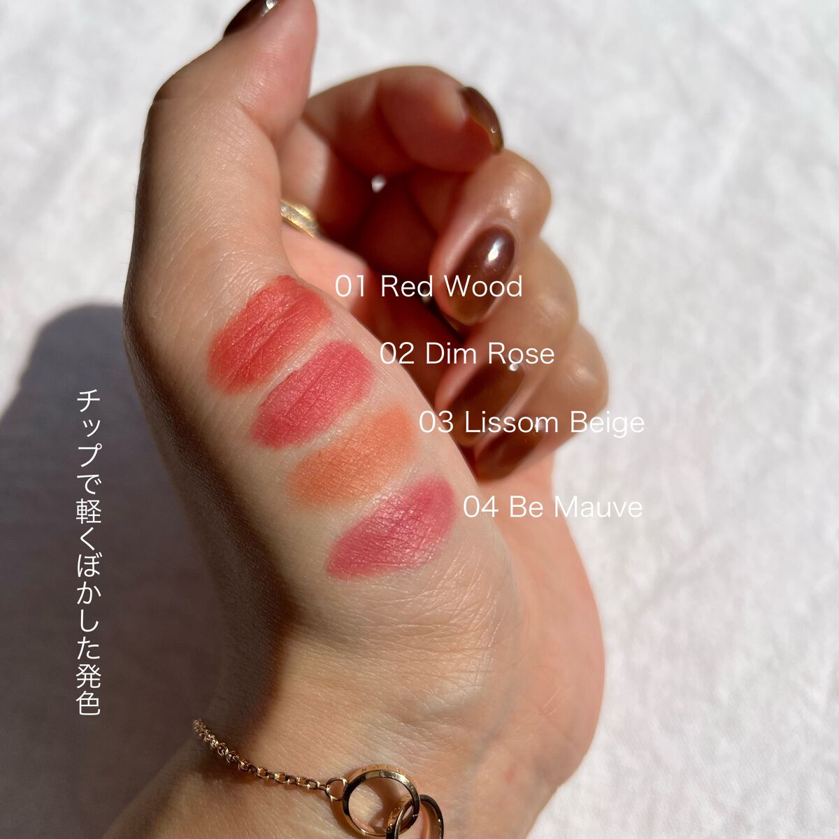 - 01 レッドウッド ジメチコン, シクロペンタシロキサン, ジメチコンクロスポリマー, トリイソステアリン酸ポリグリセリル-2, 酸化チタン, シクロヘキサシロキサン,1,2-ヘキサンジオール, セチルPEG/PPG-10/1ジメチコン, シリル化シリカ, 黄色5号, タルク, (ジメチコン/ビニルジメチコン)クロスポリマー, サリチル酸エチルヘキシル, CI 77491, サリチル酸ブチルオクチル, フェニルトリメチコン, CI 15850, 香料, 酢酸トコフェロール, CI 77499, アルキル(C30-45)ジメチコン 02 ディームローズ ジメチコン, シクロペンタシロキサン, ジメチコンクロスポリマー, トリイソステアリン酸ポリグリセリル-2, シクロヘキサシロキサン, 酸化チタン, 1.2-ヘキサンジオール, セチルPEG/PPG-10/1ジメチコン, シリル化シリカ, 黄色5号, タルク, (ジメチコン/ビニルジメチコン)クロスポリマー, サリチル酸エチルヘキシル, サリチル酸ブチルオクチル, フェニルトリメチコン, CI 15850, 香料, CI 77499, 酢酸トコフェロール, アルキル(C30-45)ジメチコン 03 リッソムベージュ ジメチコン, シクロペンタシロキサン, ジメチコンクロスポリマー, トリイソステアリン酸ポリグリセリル-2, 酸化チタン, シクロヘキサシロキサン, 1.2-ヘキサンジオール, セチルPEG/PPG-10/1ジメチコン, シリル化シリカ, タルク, (ジメチコン/ビニルジメチコン)クロスポリマー,サリチル酸エチルヘキシル, サリチル酸ブチルオクチル, フェニルトリメチコン, 黄色5号, CI 77491, 香料, 酢酸トコフェロール, アルキル(C30-45)ジメチコン, CI 77499, CI 15850 04 ビ モーヴ ジメチコン, シクロペンタシロキサン, ジメチコンクロスポリマー, トリイソステアリン酸ポリグリセリル-2, 酸化チタン, シクロヘキサシロキサン, 1.2-ヘキサンジオール, セチルPEG/PPG-10/1ジメチコン, シリル化シリカ, タルク, (ジメチコン/ビニルジメチコン)クロスポリマー, サリチル酸エチルヘキシル, サリチル酸ブチルオクチル, フェニルトリメチコン, 黄色4号, 黄色5号, CI 15850, 精製水, 酢酸トコフェロール, 香料, アルキル(C30-45)ジメチコン, 青色1号