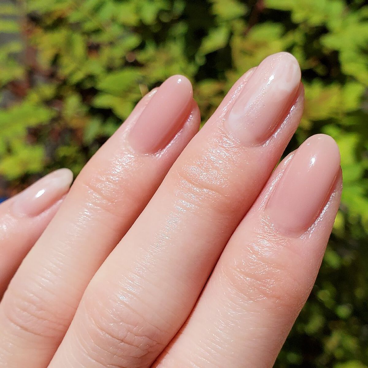 透け感がかなりあるので柔らかいホワイトネイルになります🥰 重ねてつけることで発色も増して、私は三度塗りの透け感と発色がちょうど良くて好み💖 驚いたのが速乾具合!! 今まで使ってきたネイルポリッシュの中で1番乾くの早いって思いました!! サイズ感も小さめでコスパもいいので、他のカラーも買います😍