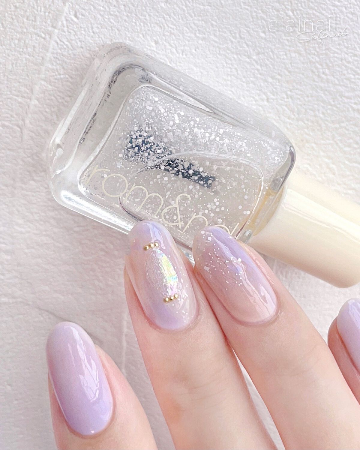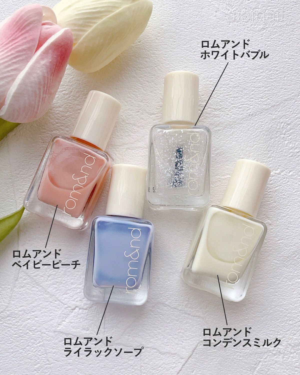 - 指先に玉石のような、ならかな光沢をとどめる。塗った瞬間から綺麗なツヤと光沢を維持し、重ねて塗っても透き通ったカラー感を鮮やかにとどめる、素早い乾燥力のナチュラルカラーネイル。「ロムアンド」の次世代型ネイルです。