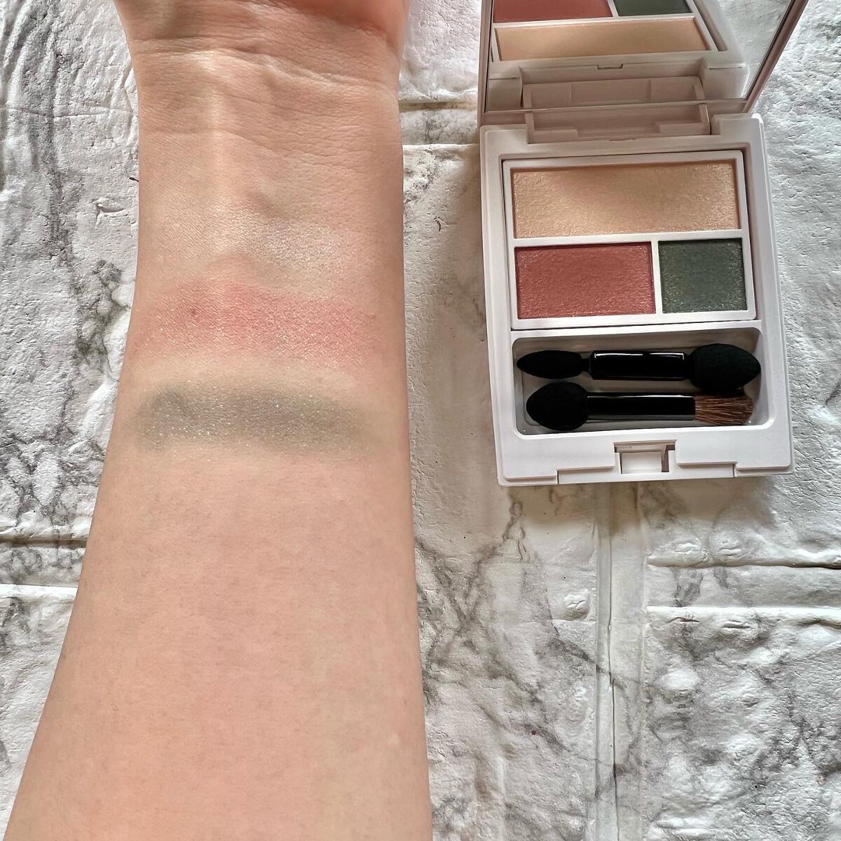 間違いなくお買い得。 何とも言えないこのきれいなグラデーションのカラーを少なくとも4色から5色位使えば、かなり目元にも奥行きが生まれそう。 しかもキラキラ型のラメが入ったアイシャドーが4色も付いているし、その他は結構マットな質感で組み合わせて使ってもかわいい。 ラメのところは大粒のラメタイプと、細かい粒子のラメタイプとそれぞれあるので、涙袋としても使えるし。普通のアイシャドーとしてラメ感を楽しみたい時にもグッド。 rom&ndのパレットシリーズは、他にもラメだらけのタイプや、マットタイプだらけのタイプ等々、いろんな種類があるのでこれは全色揃えたくなるのは何かわかる気がする笑 オフィス使いでも絶対に使える!!!お出かけにももちろん馴染むしラメがあるからパーティーでもイベントでも使えそう。家辺向きとかも書いてあったけど私的にはグリーンベースでもブルーベースでも使い方次第で全然使えると思う。 特に1番薄いベージュのスキンベージュ。ムードブラウン、ディープブラウニーはあっという間に、底見えしそう。笑