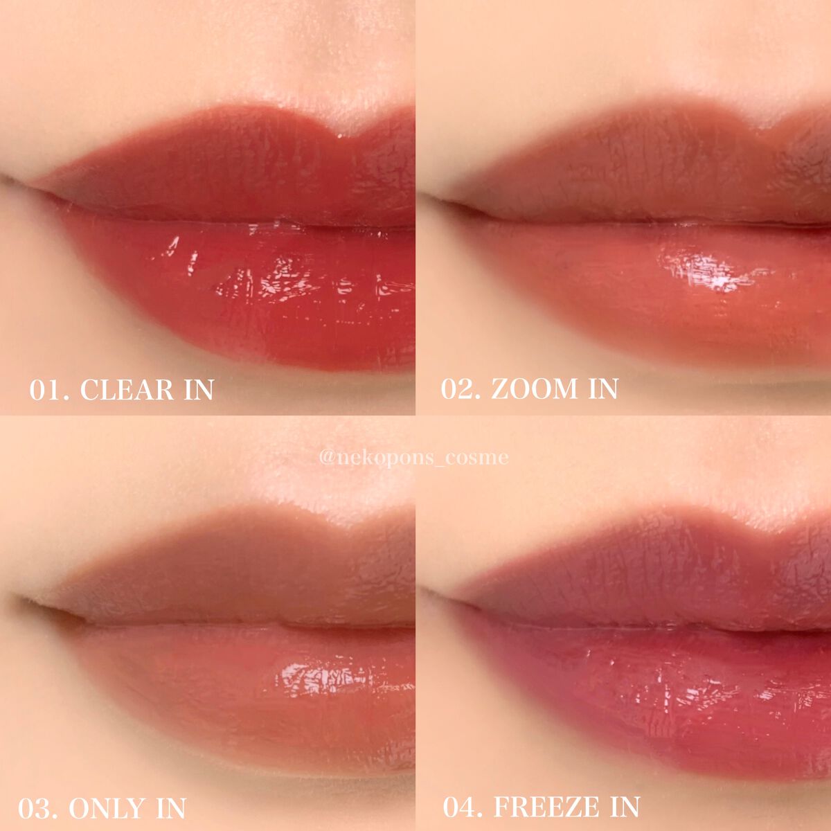 - 01 クリアイン 精製水、 ビスジグリセリルポリアシルアジペート-2、 グリセリン、 ジフェニルジメチコン、 ジフェニルシロキシフェニルトリメチコン、 リンゴ酸ジイソステアリル、 水添ポリイソブテン、 トリメチルシロキシフェニルジメチコン、 ジグリセリン、 ポリソルベート60、 イソノナン酸イソノニル、 エタノール、 ステアリン酸グリセリル、 ペンチレングリコール、 1、2-ヘキサンジオール、 ラウリルPEG-10トリス(トリメチルシロキシ)シリルエチルジメチコン 、 (アクリル酸ヒドロキシエチル/アクリロイルジメチルタウリンNa)コポリマー、 スクワラン、 酸化チタン、 ポリグリセリン-3、 黄色5号、 赤色227号、 PEG-10、 香料、 EDTA-2Na、 エチルヘキシルグリセリン、 イソステアリン酸ソルビタン、 水酸化Al、 ポリアクリル酸アンモニウム、 ステアリン酸PEG-100、 フェノキシエタノール、 BG、 青色1号 02 ズームイン 精製水、 ビスジグリセリルポリアシルアジペート-2、 グリセリン、 ジフェニルジメチコン、ジフェニルシロキシフェニルトリメチコン、 リンゴ酸ジイソステアリル、 水添ポリイソブテン、 トリメチルシロキシフェニルジメチコン、 ジグリセリン、 ポリソルベート60、 イソノナン酸イソノニル、 エタノール、 ステアリン酸グリセリル、 ペンチレングリコール、 1、2-ヘキサンジオール、 ラウリルPEG-10トリス(トリメチルシロキシ)シリルエチルジメチコン、 酸化チタン、 (アクリル酸ヒドロキシエチル/アクリロイルジメチルタウリンNa)コポリマー、 スクワラン、 ポリグリセリン-3、 黄色4号、 PEG-10、 香料、 EDTA-2Na、 エチルヘキシルグリセリン、 黄色5号、 赤色227号、 水酸化Al、 イソステアリン酸ソルビタン、 ポリアクリル酸アンモニウム、 赤104(1)、 ステアリン酸PEG-100、 フェノキシエタノール、 BG、 青色1号 03 オンリーイン 精製水、 ビスジグリセリルポリアシルアジペート-2、 グリセリン、 ジフェニルジメチコン、ジフェニルシロキシフェニルトリメチコン、 リンゴ酸ジイソステアリル、 水添ポリイソブテン、 トリメチルシロキシフェニルジメチコン、 ジグリセリン、 ポリソルベート60、 イソノナン酸イソノニル、 エタノール、 ステアリン酸グリセリル、 ペンチレングリコール、 1、2-ヘキサンジオール、 ラウリルPEG-10トリス(トリメチルシロキシ)シリルエチルジメチコン 、 (アクリル酸ヒドロキシエチル/アクリロイルジメチルタウリンNa)コポリマー、 酸化チタン、 スクワラン、 ポリグリセリン-3、 黄色5号、 PEG-10、 香料、 EDTA-2Na、 エチルヘキシルグリセリン、 イソステアリン酸ソルビタン、 赤色227号、 黄色4号、 水酸化Al、 ポリアクリル酸アンモニウム、 赤104(1) ステアリン酸PEG-100、 フェノキシエタノール、 青色1号、 BG 04 フリーズイン 精製水、 ビスジグリセリルポリアシルアジペート-2、 グリセリン、 ジフェニルジメチコン、ジフェニルシロキシフェニルトリメチコン、 リンゴ酸ジイソステアリル、 水添ポリイソブテン、 トリメチルシロキシフェニルジメチコン、 ジグリセリン、 ポリソルベート60、 イソノナン酸イソノニル、 エタノール、 ステアリン酸グリセリル、 ペンチレングリコール、 1、2-ヘキサンジオール、 ラウリルPEG-10トリス(トリメチルシロキシ)シリルエチルジメチコン 、 (アクリル酸ヒドロキシエチル/アクリロイルジメチルタウリンNa)コポリマー、 酸化チタン、 スクワラン、 ポリグリセリン-3、 黄色5号、 PEG-10、 香料、 EDTA-2Na、 エチルヘキシルグリセリン、 赤色227号、 イソステアリン酸ソルビタン、 赤104(1)、 水酸化Al、 ポリアクリル酸アンモニウム、 ステアリン酸PEG-100、 フェノキシエタノール、 BG、 青色1号