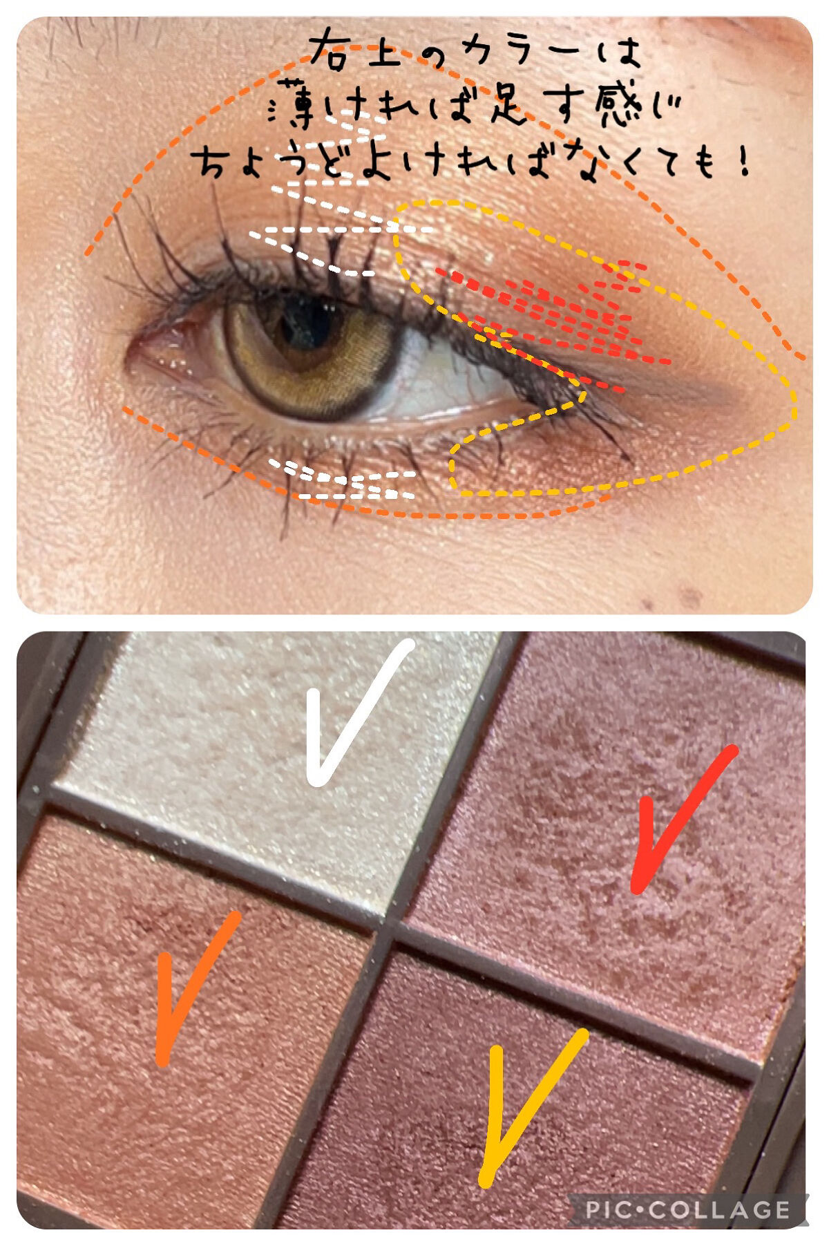 溶け合う色とパールで上品にツヤめく目元へ〜 AのラメとCのオレンジが特に可愛い! オレンジは目尻側に使うのが基本の使い方だけど濃すぎないから目頭側から使っても違和感なかったよ👌 1st2ndイエベの自分的にちょうど良い色合いで同じく廃番になる01のウォームコーラルよりも気に入った♪