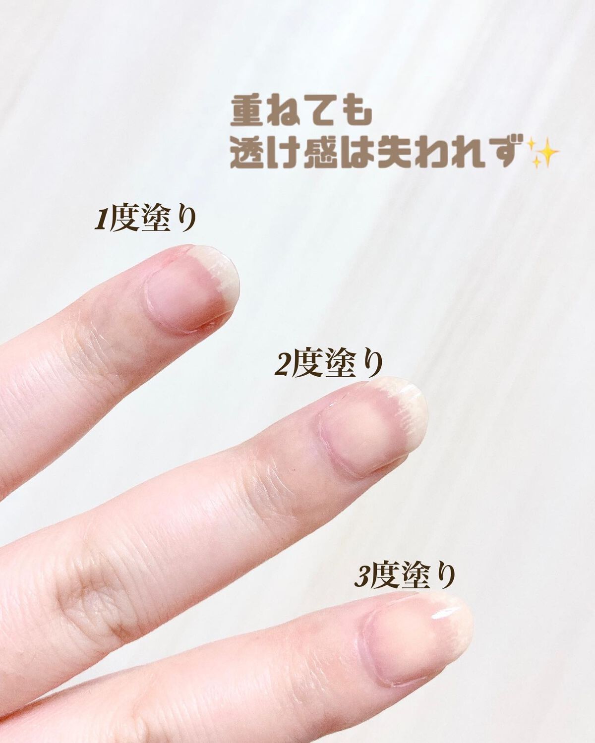 - 自分らしく色を楽しむ抜け感ネイルが登場! これ1本で爪を保護・保湿しながらカラーを楽しめる!塗り重ねる回数でお好みの色に調整できる抜け感ネイルコートです。 ベースコート、ネイルカラー、トップコートがひとつになったオールインワンタイプ。